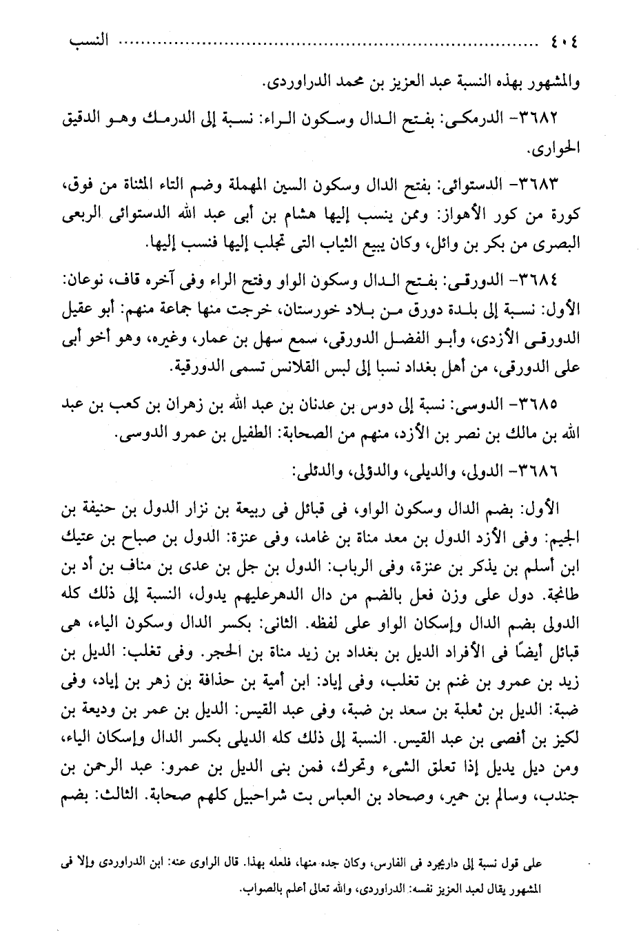 3684 - الدورقى: بفتح الدال وسكون الواو وفتح الراء وفى آخره قاف، نوعان: الأول: نسبة إلى بلدة دورق من بلاد خورستان، خرجت منها جماعة منهم: أبو عقيل الدورقى الأزدى، وأبو الفضل الدورقى، سمع سهل بن عمار، وغيره، وهو أخو أبى على الدورقى، من أهل بغداد نسبا إلى لبس القلانس تسمى الدورقية.