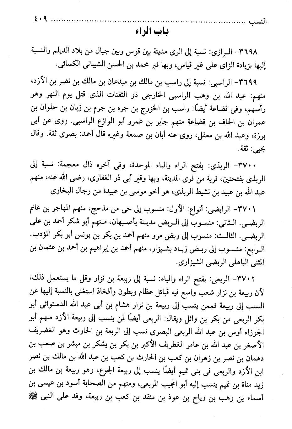 3701 - الرابضى: أنواع: الأول: منسوب إلى حى من مذجح، منهم المهاجر بن غانم الربضى. الثانى: منسوب إلى الربض مدينة بأصبهان، منهم أبو شكر أحمد بن على الربضى. الثالث: منسوب إلى ربض مرو منهم أحمد بن بكر بن يونس أبو بكر المؤدب. الرابع: منسوب إلى ربض زياد بشيزار، منهم أحمد بن إبراهيم بن أحمد بن عثمان بن المثنى الباهلى الربضى الشيزارى.