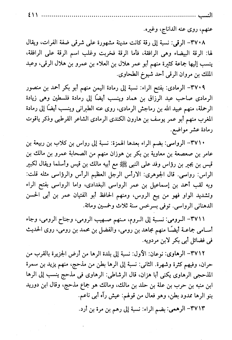 3711 - الرومى: نسبة إلى الروم، منهم صهيب الرومى، وجناح الرومى، وجاء أسامى جماعة أيضًا منهم مجاهد بن رومى، والفضل بن محمد بن رومى، روى الحديث فى فضائل أبى بكر لابن مردويه.