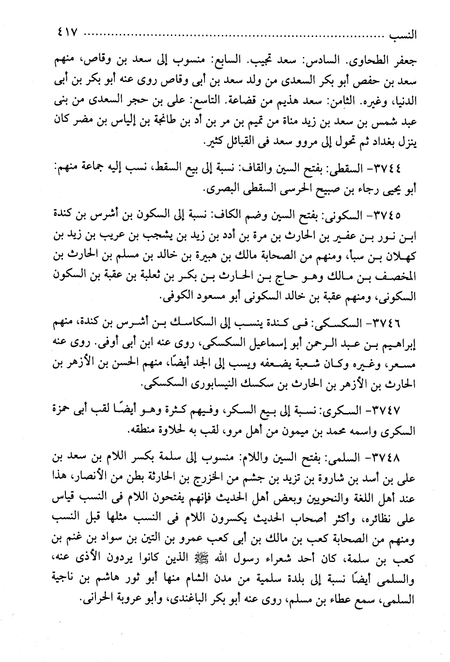 3745 - السكونى: بفتح السين وضم الكاف: نسبة إلى السكون بن أشرس بن كندة ابن نور بن عفير بن الحارث بن مرة بن أدد بن زيد بن يشجب بن عريب بن زيد بن كهلان بن سبأ، ومنهم من الصحابة مالك بن هبيرة بن خالد بن مسلم بن الحارث بن المخصف بن مالك وهو حاج بن الحارث بن بكر بن ثعلبة بن عقبة بن السكون السكونى، ومنهم عقبة بن خالد السكونى أبو مسعود الكوفى.