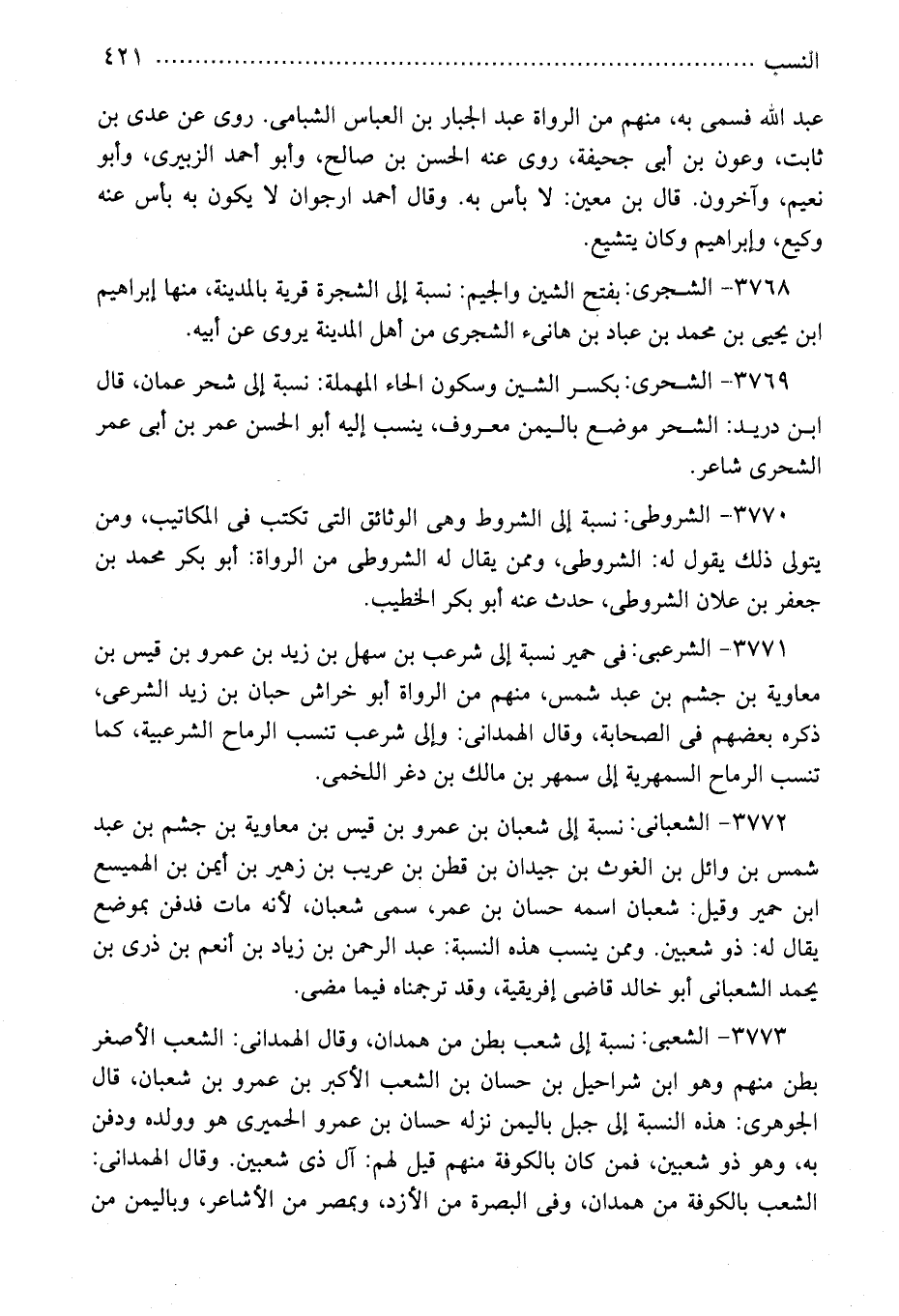 3771 - الشرعبى: فى حمير نسبة إلى شرعب بن سهل بن زيد بن عمرو بن قيس بن معاوية بن جشم بن عبد شمس، منهم من الرواة أبو خراش حبان بن زيد الشرعى، ذكره بعضهم فى الصحابة، وقال الهمدانى: وإلى شرعب تنسب الرماح الشرعبية، كما تنسب الرماح السمهرية إلى سمهر بن مالك بن دغر اللخمى.
