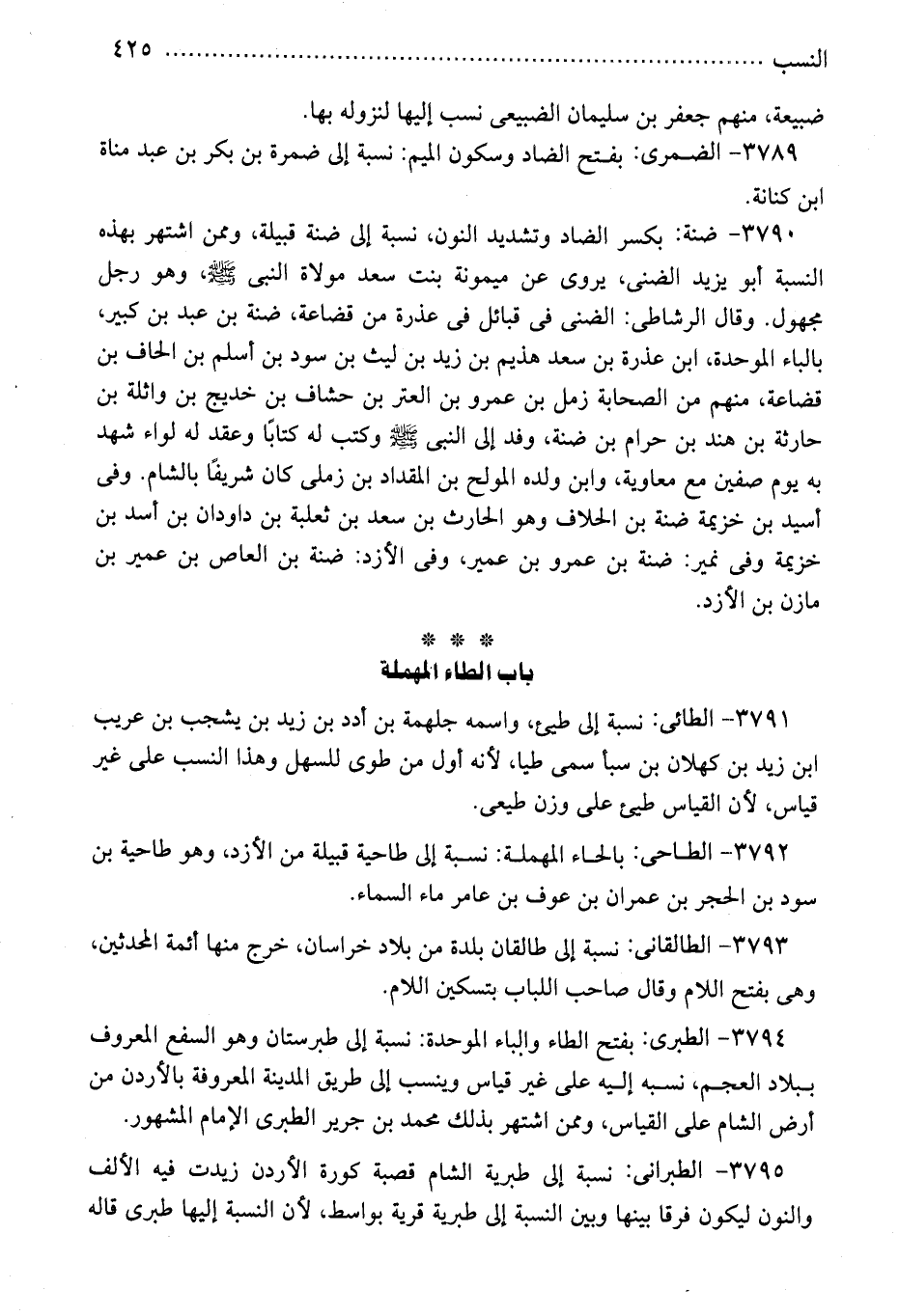 3791 - الطائى: نسبة إلى طيئ، واسمه جلهمة بن أدد بن زيد بن يشجب بن عريب ابن زيد بن كهلان بن سبأ سمى طيا، لأنه أول من طوى للسهل وهذا النسب على غير قياس، لأن القياس طيئ على وزن طيعى.