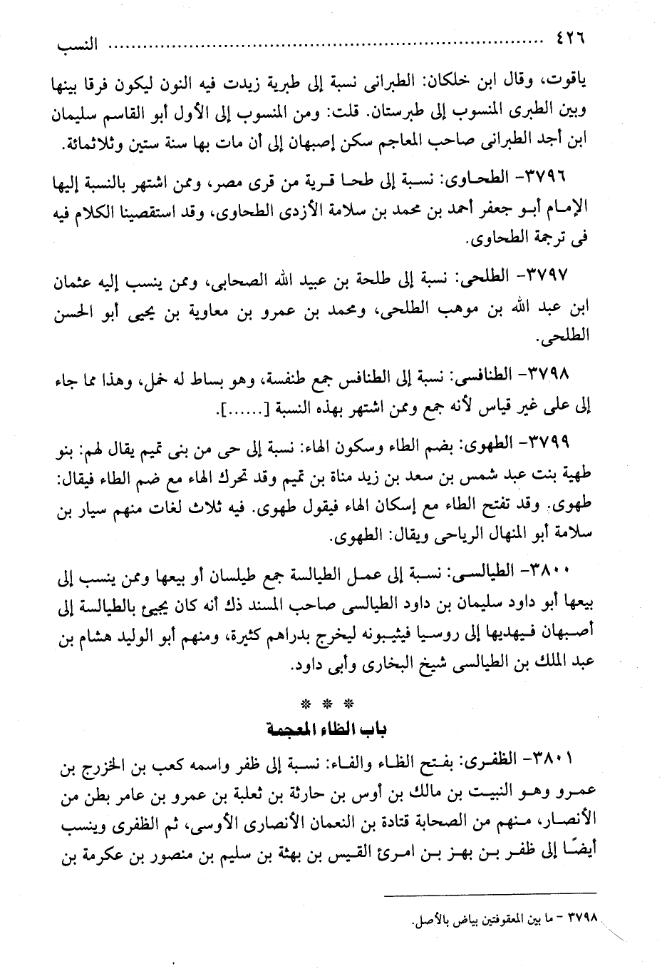 3801 - الظفرى: بفتح الظاء والفاء: نسبة إلى ظفر واسمه كعب بن الخزرج بن عمرو وهو النبيت بن مالك بن أوس بن حارثة بن ثعلبة بن عمرو بن عامر بطن من الأنصار، منهم من الصحابة قتادة بن النعمان الأنصارى الأوسى، ثم الظفرى وينسب أيضًا إلى ظفر بن بهز بن امرئ القيس بن بهثة بن سليم بن منصور بن عكرمة بن