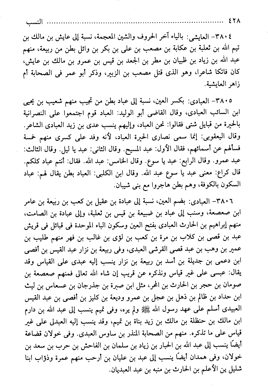 3806 - العبادى: بضم العين، نسبة إلى عبادة بن عقيل بن كعب بن ربيعة بن عامر ابن صعصعة، وسنب إلى عباد بن ضبيعة بن قيس بن ثعلبة، وإلى عبادة بن الصامت، منهم إبراهيم بن الحارث العبادى بفتح العين وسكون الباء الموحدة فى قبائل فى قريش عبد بن قصى بن كلاب بن مرة بن كعب بن لؤى بن غالب بن فهر منهم طليب بن عمير بن وهب بن عبد قصى القرشى العبدى، وفى ربيعة بن نزار عبد القيس بن أفصى ابن دعمى بن جديلة بن أسد بن ربيعة بن نزار ينسب إليه عبدى على القياس وقد يقال: عبسى على غير قياس ونذكره عن قريب إن شاء الله تعالى فمنهم صعصعة بن صومان بن حجر بن الحارث بن المحر، مثل ابن صبرة بن جذرجان بن عسعاس بن ليث ابن حداد بن ظالم بن ذهل بن عجل بن عمرو وديعة بن كليز بن أفصى بن عبد القيس العبيدى أسلم على عهد رسول الله - صلى الله عليه وسلم - ولم يره، وفى تميم ينسب إلى عبد الله بن دارم ابن مالك بن حنظلة بن مالك بن زيد بناة بن تميم، وقد ينسب إليه العبدلى على غير قياس على ما تذكره. منهم من الصحابة المنذر بن ساوس العبدى. وفى خولان قضاعة أيضًا ينسب إلى عبد الله بن الحبار بن زياد بن سلمان بن الفاحش بن حرب بن سعد بن خولان، وفى همدان أيضًا ينسب إلى عبد بن عليان بن أرحب منهم عمرة وذؤاب ابنا شليل ين الأعلم بن الحارث بن منبه بن عبد العبديان.