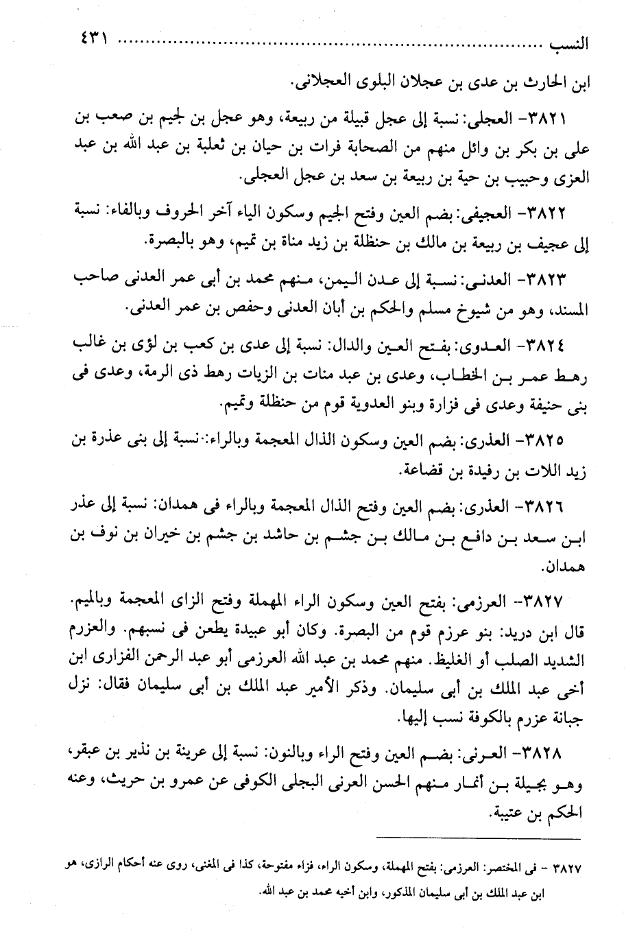 3821 - العجلى: نسبة إلى عجل قبيلة من ربيعة، وهو عجل بن لجيم بن صعب بن على بن بكر بن وائل منهم من الصحابة فرات بن حيان بن ثعلبة بن عبد الله بن عبد العزى وحبيب بن حية بن ربيعة بن سعد بن عجل العجلى.