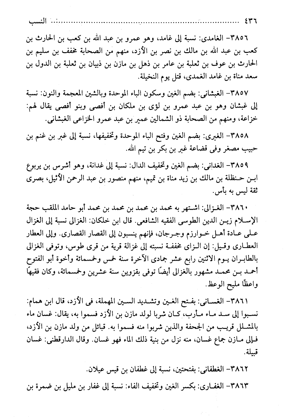 3860 - الغزالى: اشتهر به محمد بن محمد بن محمد بن محمد أبو حامد الملقب حجة الإسلام زين الدين الطوسى الفقيه الشافعى. قال ابن خلكان: الغزالى نسبة إلى الغزال على عادة أهل خوارزم وجرجان، فإنهم ينسبون إلى القصار القصارى. وإلى العطار العطارى وقيل: إن الزاى مخففة نسبته إلى غزالة قرية من قرى طوس، وتوفى الغزالى بالطابران يوم الاثنين رابع عشر جمادى الآخرة سنة خمس وخمسمائة وأخوة أبو الفتوح أحمد بن محمد مشهور بالغزالى أيضًا توفى بقزوين سنة عشرين وخمسمائة، وكان فقيهًا واعظًا مليح الوعظ.