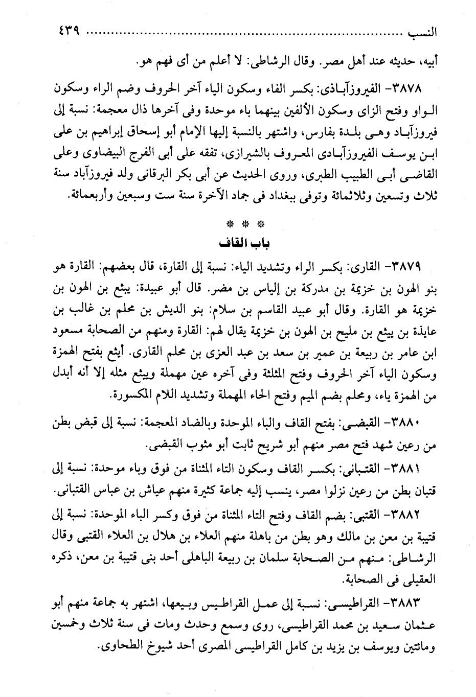 3879 - القارى: بكسر الراء وتشديد الياء: نسبة إلى القارة، قال بعضهم: القارة هو بنو الهون بن خزيمة بن مدركة بن إلياس بن مضر. قال أبو عبيدة: يبثع بن الهون بن خزيمة هو القارة. وقال أبو عبيد القاسم بن سلام: بنو الديش بن محلم بن غالب بن عايذة بن ييثع بن مليح بن الهون بن خزيمة يقال لهم: القارة ومنهم من الصحابة مسعود ابن عامر بن ربيعة بن عمير بن سعد بن عبد العزى بن محلم القارى. أيثع بفتح الهمزة وسكون الياء آخر الحروف وفتح المثلثة وفى آخره عين مهملة وييثع مثله إلا أنه أبدل من الهمزة ياء، ومحلم بضم الميم وفتح الحاء المهملة وتشديد اللام المكسورة.