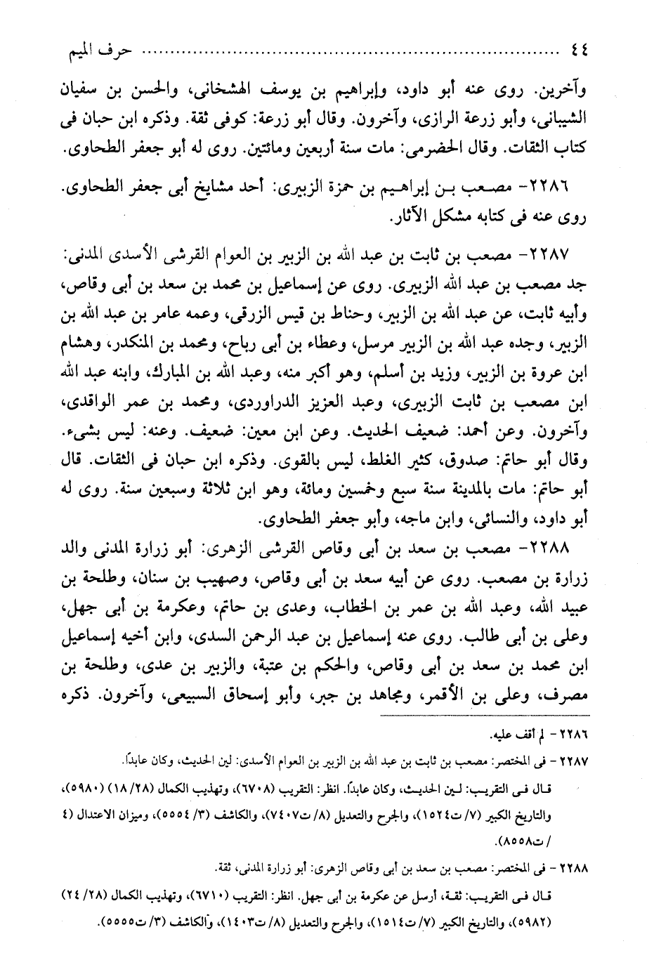 2286 - مصعب بن إبراهيم بن حمزة الزبيرى: أحد مشايخ أبى جعفر الطحاوى. روى عنه فى كتابه مشكل الآثار.