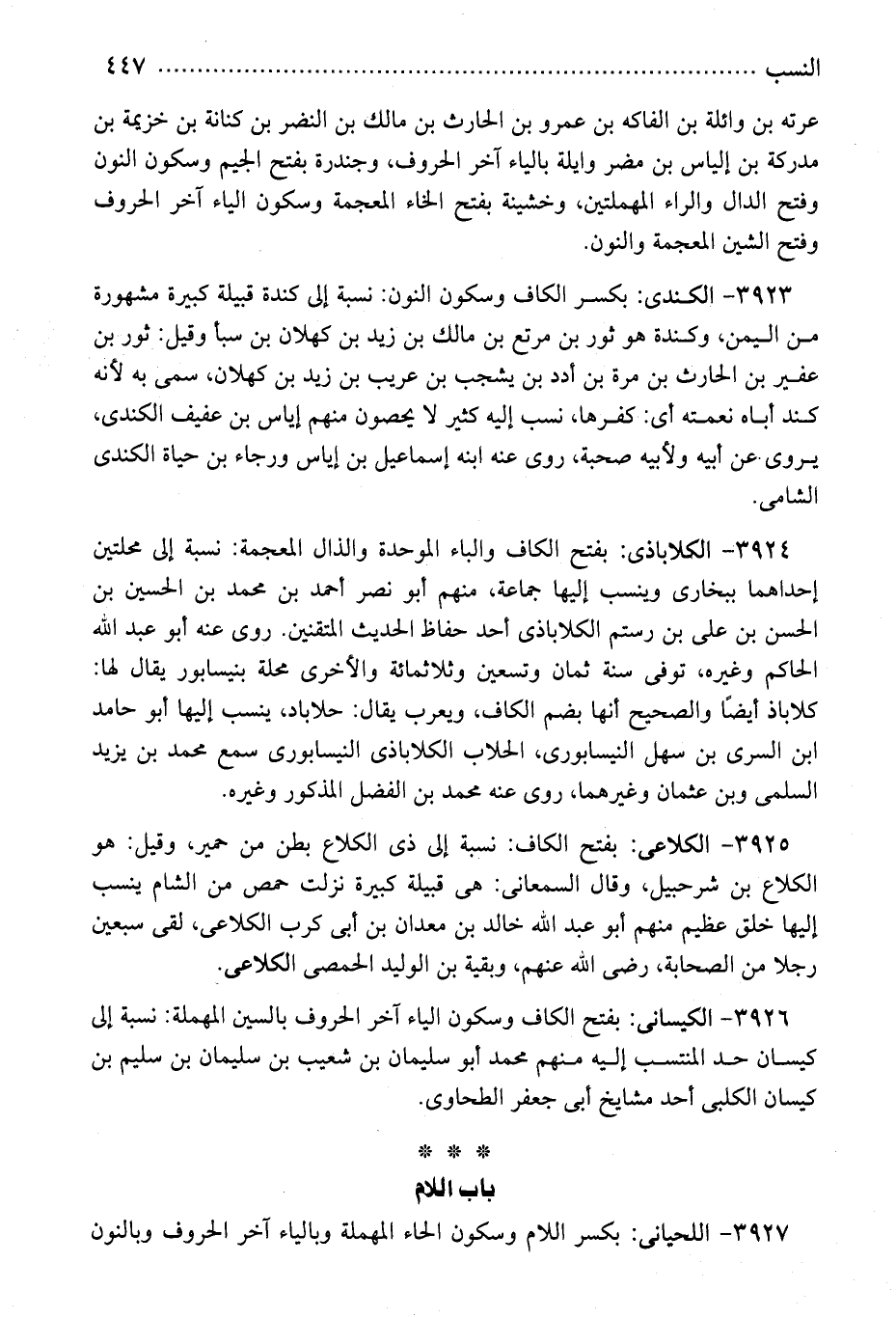 3924 - الكلاباذى: بفتح الكاف والباء الموحدة والذال المعجمة: نسبة إلى محلتين إحداهما ببخارى وينسب إليها جماعة، منهم أبو نصر أحمد بن محمد بن الحسين بن الحسن بن على بن رستم الكلاباذى أحد حفاظ الحديث المتقنين. روى عنه أبو عبد الله الحاكم وغيره، توفى سنة ثمان وتسعين وثلاثمائة والأخرى محلة بنيسابور يقال لها: كلاباذ أيضًا والصحيح أنها بضم الكاف، ويعرب يقال: حلاباد، ينسب إليها أبو حامد ابن السرى بن سهل النيسابورى، الحلاب الكلاباذى النيسابورى سمع محمد بن يزيد السلمى وبن عثمان وغيرهما، روى عنه محمد بن الفضل المذكور وغيره.