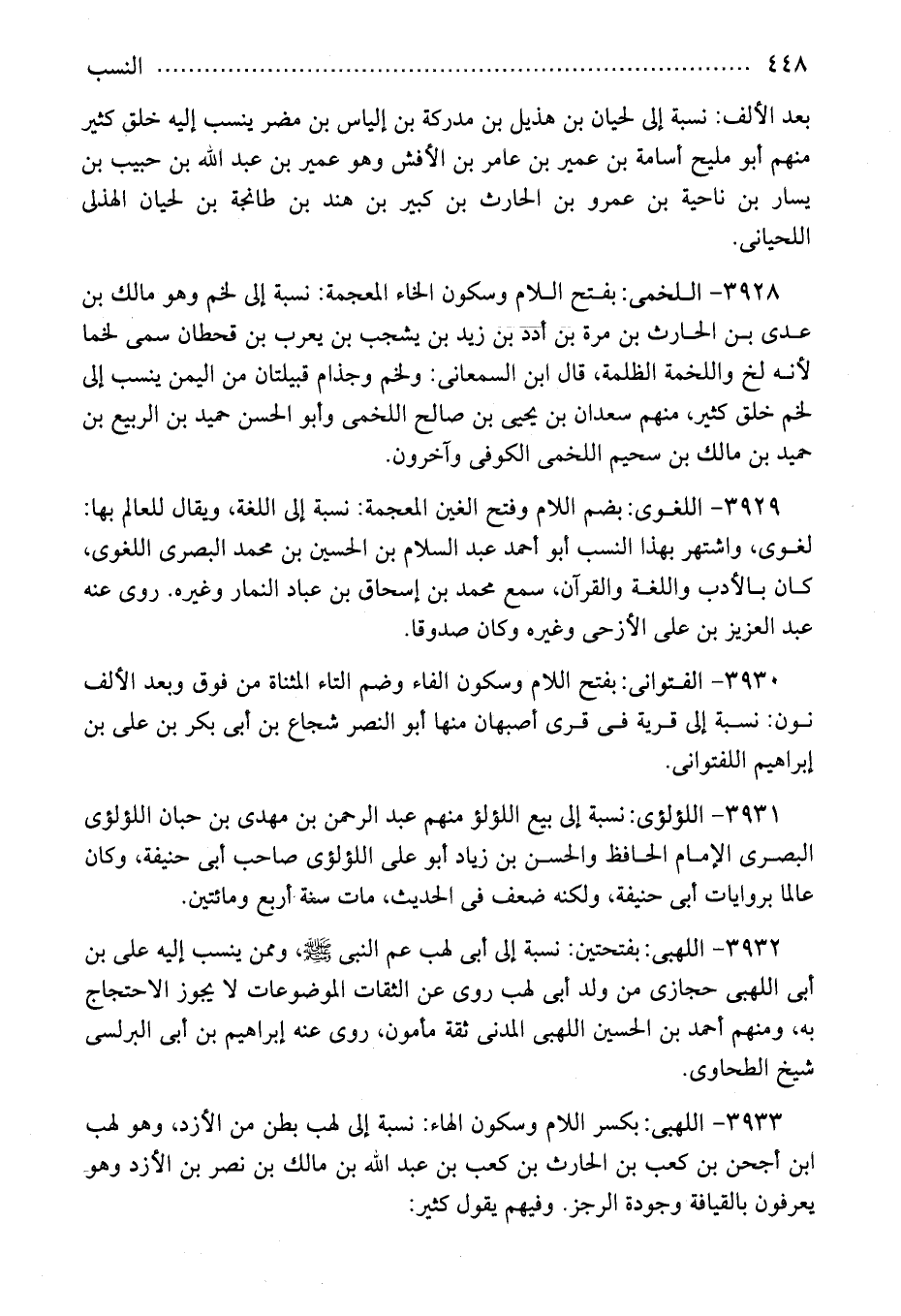 3933 - اللهبى: بكسر اللام وسكون الهاء: نسبة إلى لهب بطن من الأزد، وهو لهب ابن أجحن بن كعب بن الحارث بن كعب بن عبد الله بن مالك بن نصر بن الأزد وهو يعرفون بالقيافة وجودة الرجز. وفيهم يقول كثير: