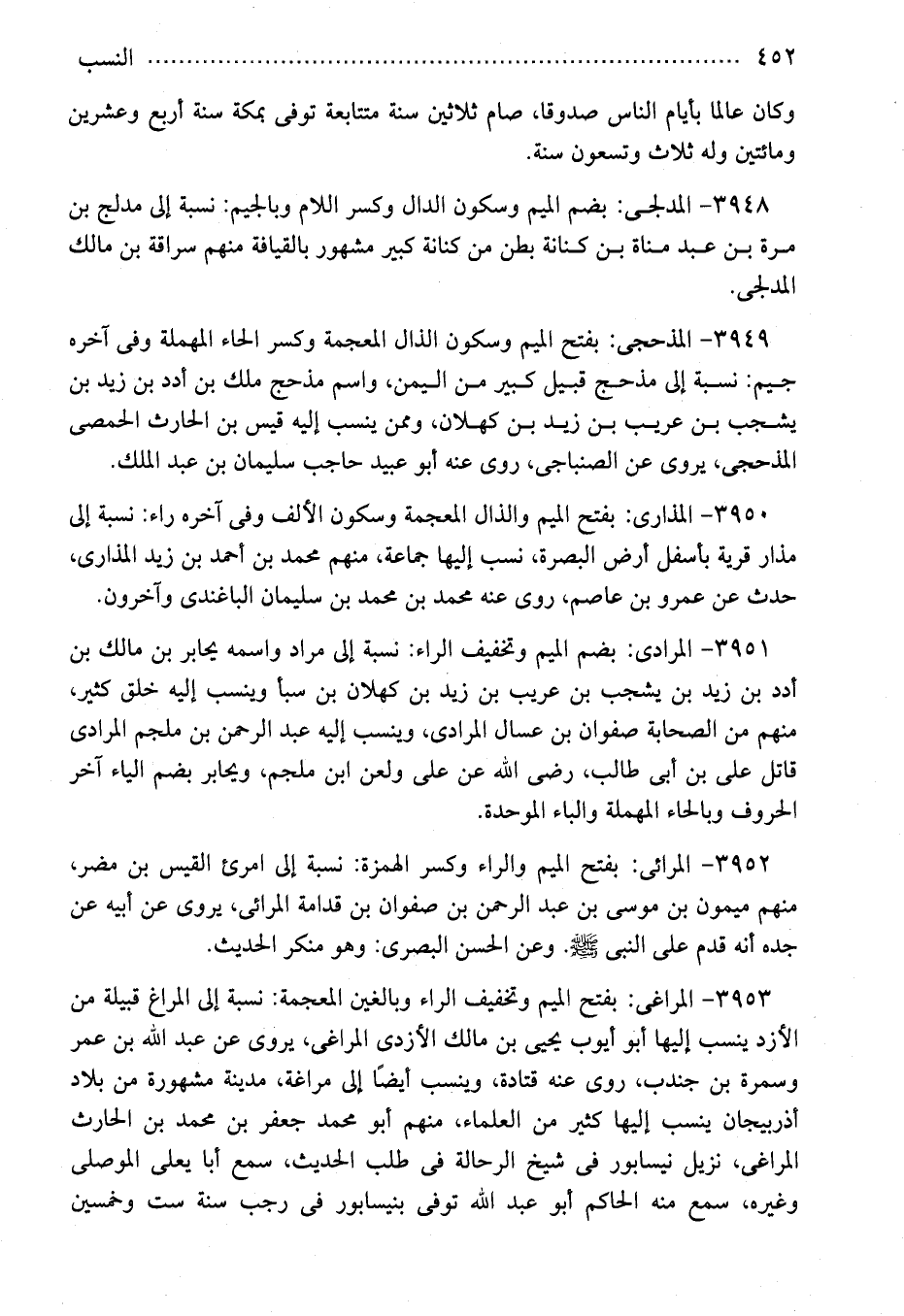 3948 - المدلجى: بضم الميم وسكون الدال وكسر اللام وبالجيم: نسبة إلى مدلج بن مرة بن عبد مناة بن كنانة بطن من كنانة كبير مشهور بالقيافة منهم سراقة بن مالك المدلجى.