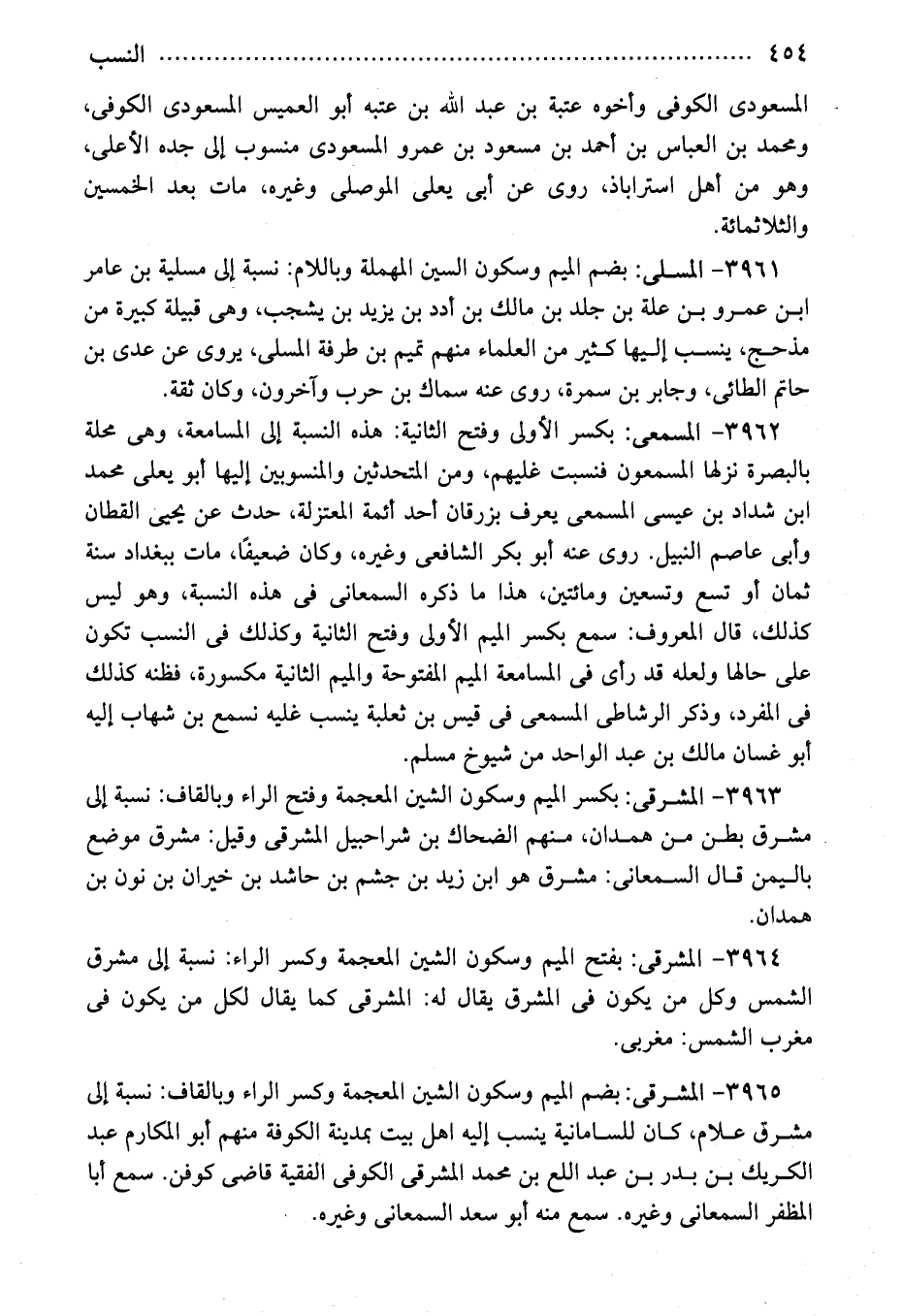 3962 - المسمعى: بكسر الأولى وفتح الثانية: هذه النسبة إلى المسامعة، وهى محلة بالبصرة نزلها المسمعون فنسبت غليهم، ومن المتحدثين والمنسوبين إليها أبو يعلى محمد ابن شداد بن عيسى المسمعى يعرف بزرقان أحد أئمة المعتزلة، حدث عن يحيى القطان وأبى عاصم النبيل. روى عنه أبو بكر الشافعى وغيره، وكان ضعيفًا، مات ببغداد سنة ثمان أو تسع وتسعين ومائتين، هذا ما ذكره السمعانى فى هذه النسبة، وهو ليس كذلك، قال المعروف: سمع بكسر الميم الأوليوفتح الثانية وكذلك فى النسب تكون على حالها ولعله قد رأى فى المسامعة الميم المفتوحة والميم الثانية مكسورة، فظنه كذلك فى المفرد، وذكر الرشاطى المسمعى فى قيس بن ثعلبة ينسب غليه نسمع بن شهاب إليه أبو غسان مالك بن عبد الواحد من شيوخ مسلم.