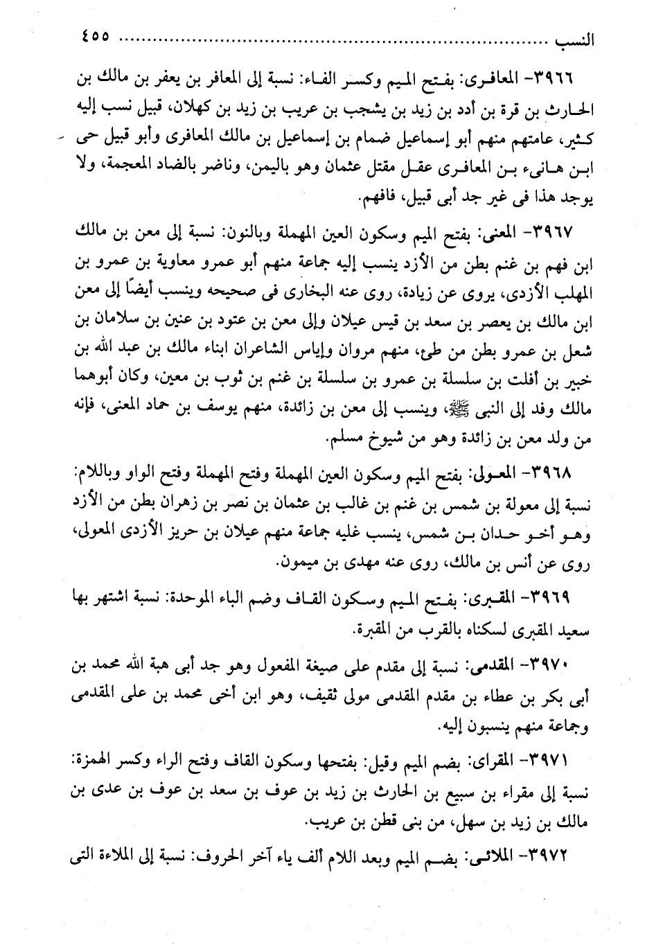 3966 - المعافرى: بفتح الميم وكسر الفاء: نسبة إلى المعافر بن يعفر بن مالك بن الحارث بن قرة بن أدد بن زيد بن يشجب بن عريب بن زيد بن كهلان، قبيل نسب إليه كثير، عامتهم منهم أبو إسماعيل ضمام بن إسماعيل بن مالك المعافرى وأبو قبيل حى ابن هانىء بن المعافرى عقل مقتل عثمان وهو باليمن، وناضر بالضاد المعجمة، ولا يوجد هذا فى غير جد أبى قبيل، فافهم.