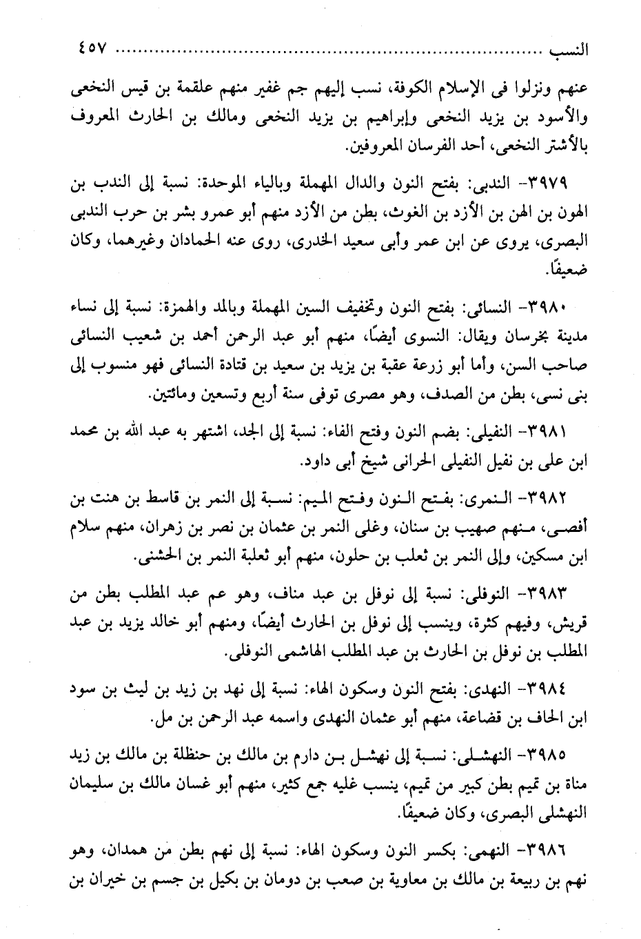 3985 - النهشلى: نسبة إلى نهشل بن دارم بن مالك بن حنظلة بن مالك بن زيد مناة بن تميم بطن كبير من تميم، ينسب غليه جمع كثير، منهم أبو غسان مالك بن سليمان النهشلى البصرى، وكان ضعيفًا.