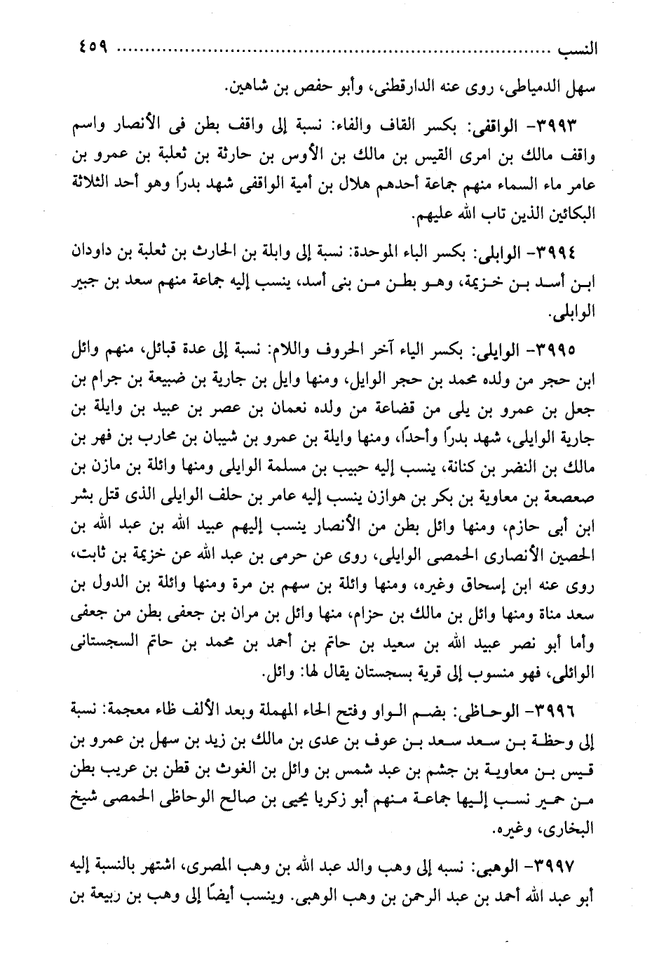 3997 - الوهبى: نسبه إلى وهب والد عبد الله بن وهب المصرى، اشتهر بالنسبة إليه أبو عبد الله احمد بن عبد الرحمن بن وهب الوهبى. وينسب أيضًا إلى وهب بن ربيعة بن