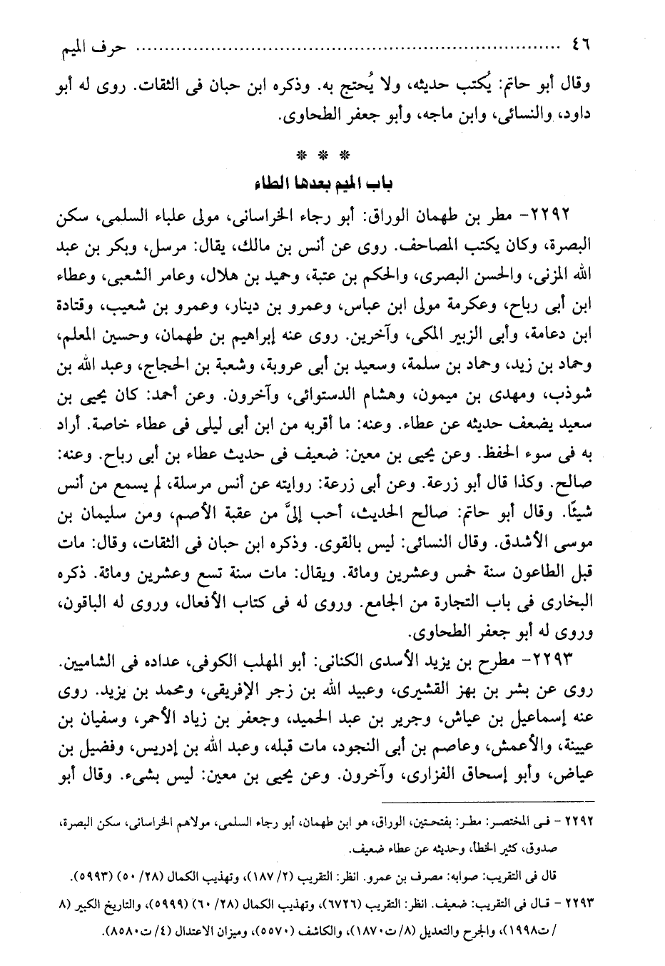 2292 - فى المختصر: مطر: بفتحتين، الوراق، هو ابن طهمان، أبو رجاء السلمى، مولاهم الخراسانى، سكن البصرة، صدوق، كثير الخطأ، وحديثه عن عطاء ضعيف. =