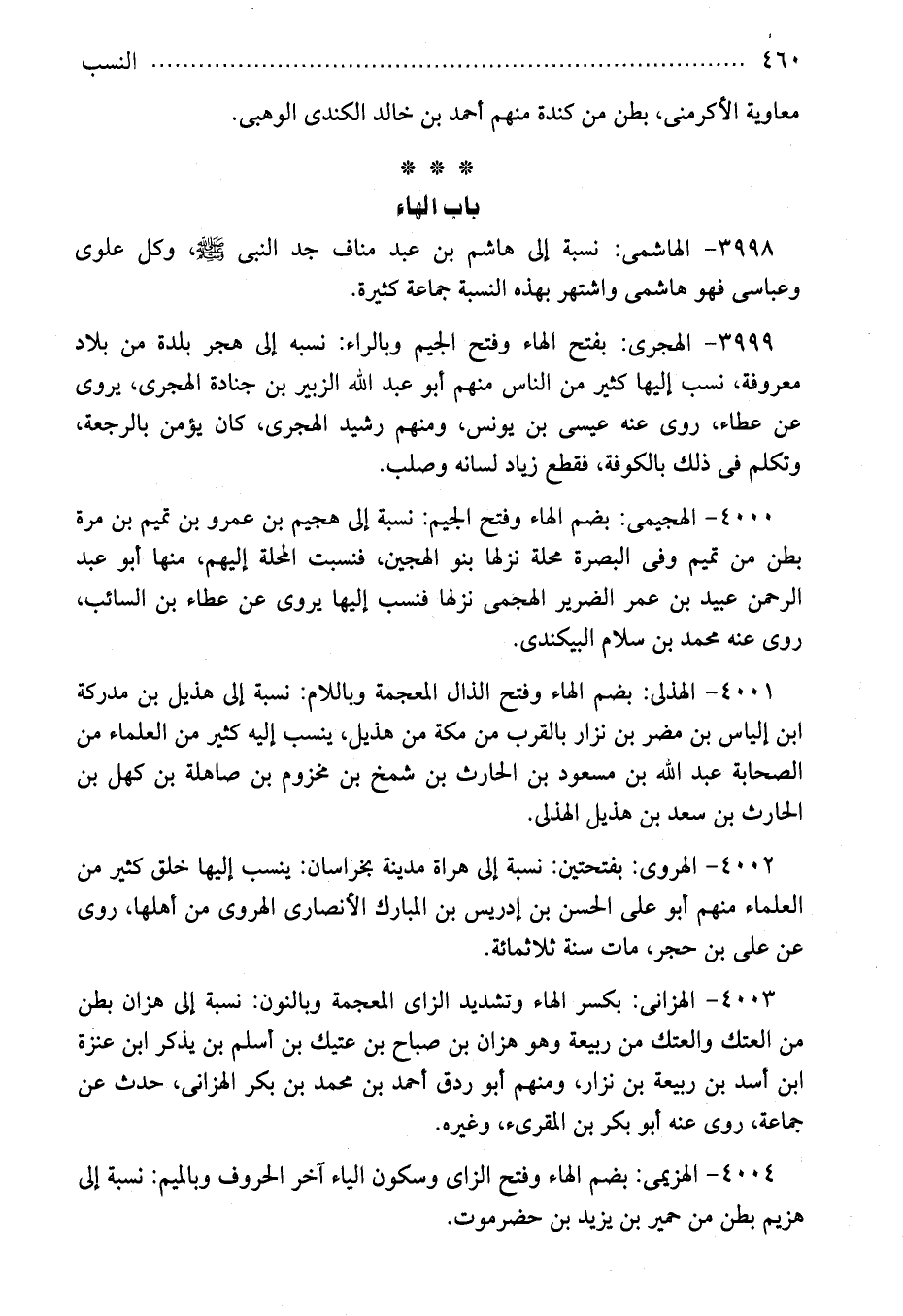 3998 - الهاشمى: نسبة إلى هاشم بن عبد مناف جد النبى - صلى الله عليه وسلم -، وكل علوى وعباسى فهو هاشمى واشتهر بهذه النسبة جماعة كثيرة.