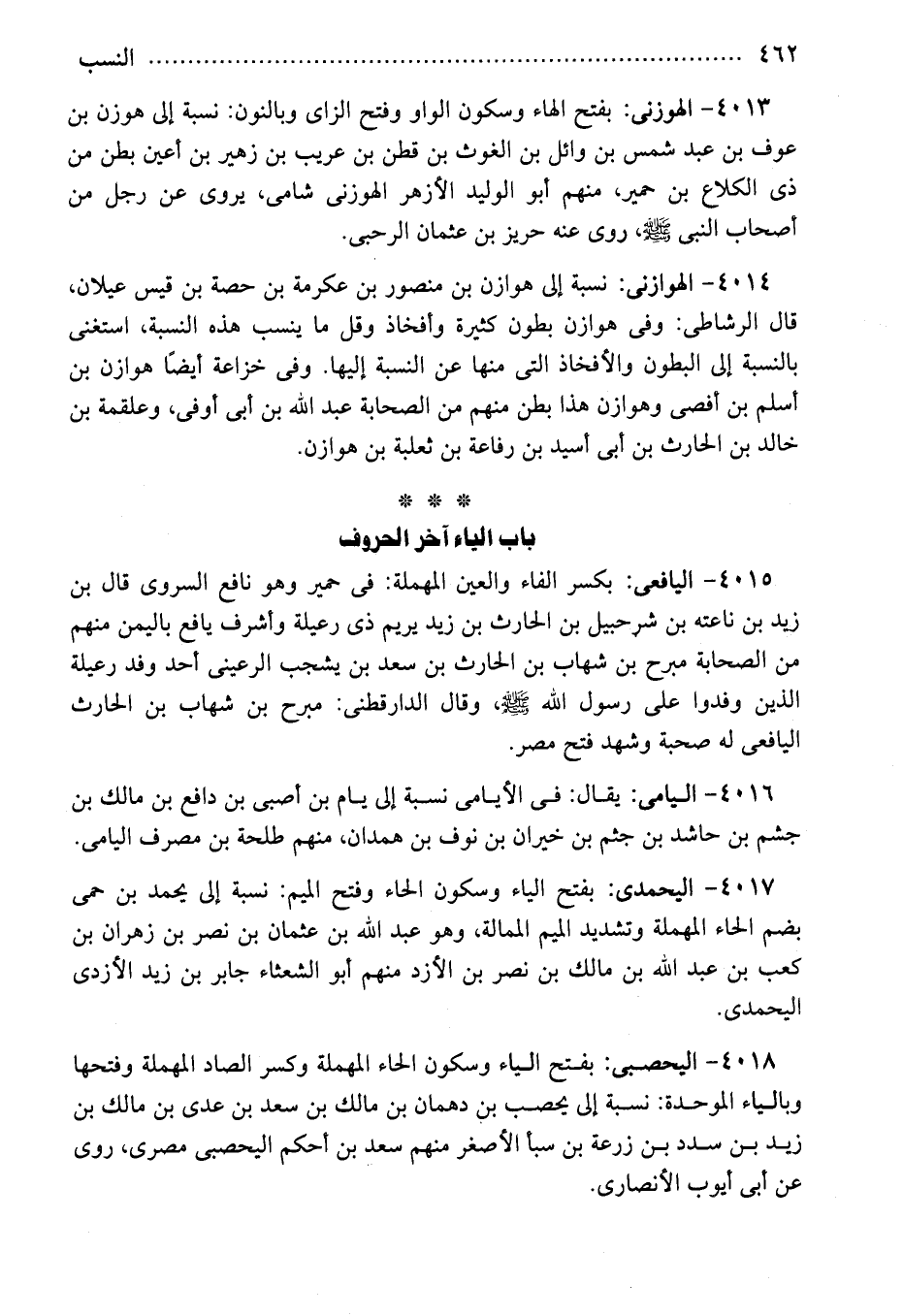 4013 - الهوزنى: بفتح الهاء وسكون الواو وفتح الزاى وبالنون: نسبة إلى هوزن بن عوف بن عبد شمس بن وائل بن الغوث بن قطن بن عريب بن زهير بن أعين بطن من ذى الكلاع بن حمير، منهم أبو الوليد الأزهر الهوزنى شامى، يروى عن رجل من أصحاب النبى - صلى الله عليه وسلم -، روى عنه حريز بن عثمان الرحبى.