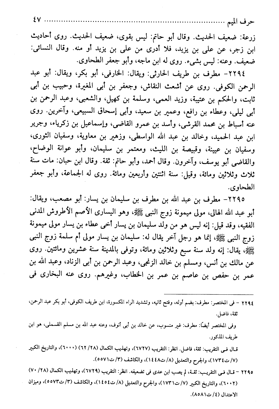 2294 - فى المختصر: مطرف: بضم أوله، وفتح ثانيه، وتشديد الراء المكسورة، ابن طريف الكوفى، أبو بكر عبد الرحمن، ثقة، فاضل. =