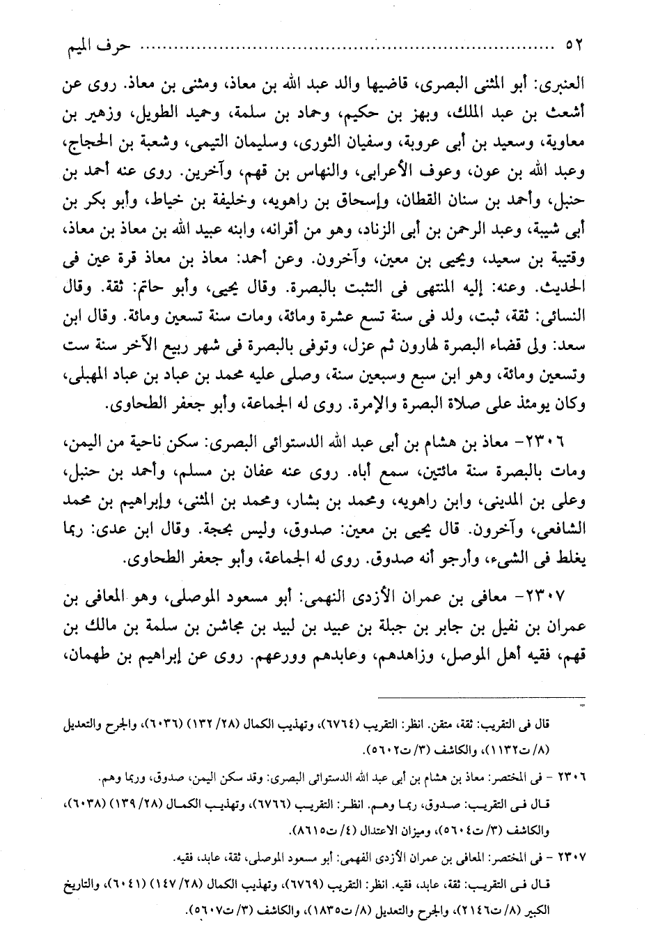 2307 - معافى بن عمران الأزدى النهمى: أبو مسعود الموصلى، وهو المعافى بن عمران بن نفيل بن جابر بن جبلة بن عبيد بن لبيد بن مجاشن بن سلمة بن مالك بن قهم، فقيه أهل الموصل، وزاهدهم، وعابدهم وورعهم. روى عن إبراهيم بن طهمان،