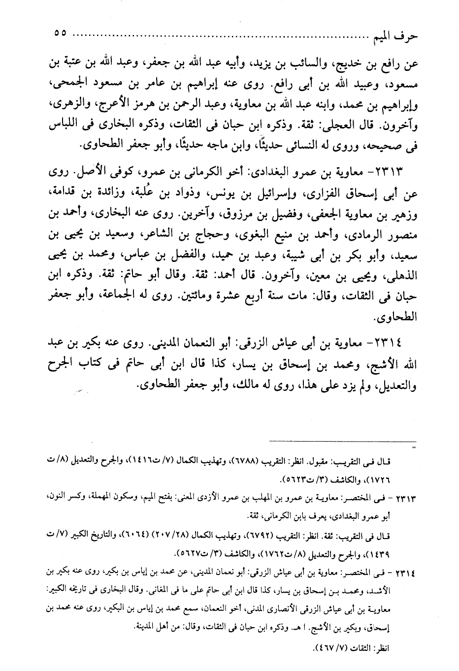 2313 - فى المختصر: معاوية بن عمرو بن المهلب بن عمرو الأزدى المعنى: بفتح الميم، وسكون المهملة، وكسر النون، أبو عمرو البغدادى، يعرف بابن الكرمانى، ثقة.