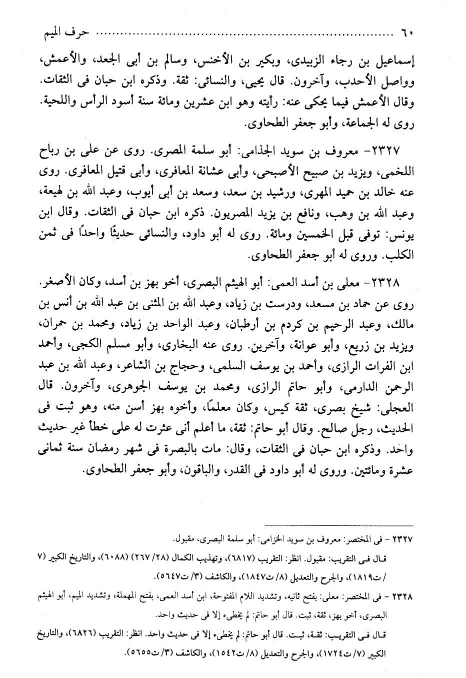 2328 - فى المختصر: معلى: بفتح ثانيه، وتشديد اللام المفتوحة، ابن أسد العمى، بفتح المهملة، وتشديد الميم، أبو الهيثم البصرى، أخو بهز، ثقة، ثبت. قال أبو حاتم: لم يخطىء إلا فى حديث واحد.