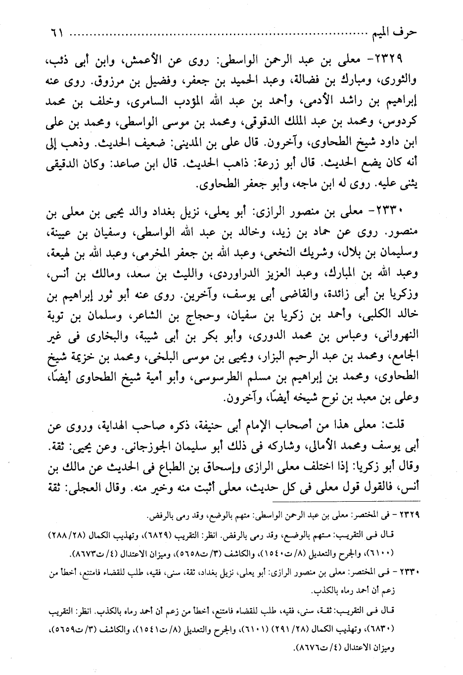 2329 - فى المختصر: معلى بن عبد الرحمن الواسطى: متهم بالوضع، وقد رمى بالرفض.