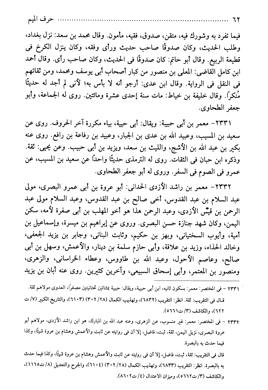 2332 - فى المختصر: معمر: غير منسوب، عن الزهرى، وعنه عبد الله بن المبارك، هو ابن راشد الأزدى، مولاهم أبو عروة البصرى، نزيل اليمن، ثقة، ثبت، فاضل، إلا أن فى روايته عن ثابت والأعمش وهشام بن عروة شيئًا، وكذا فيما حدث به بالبصرة.