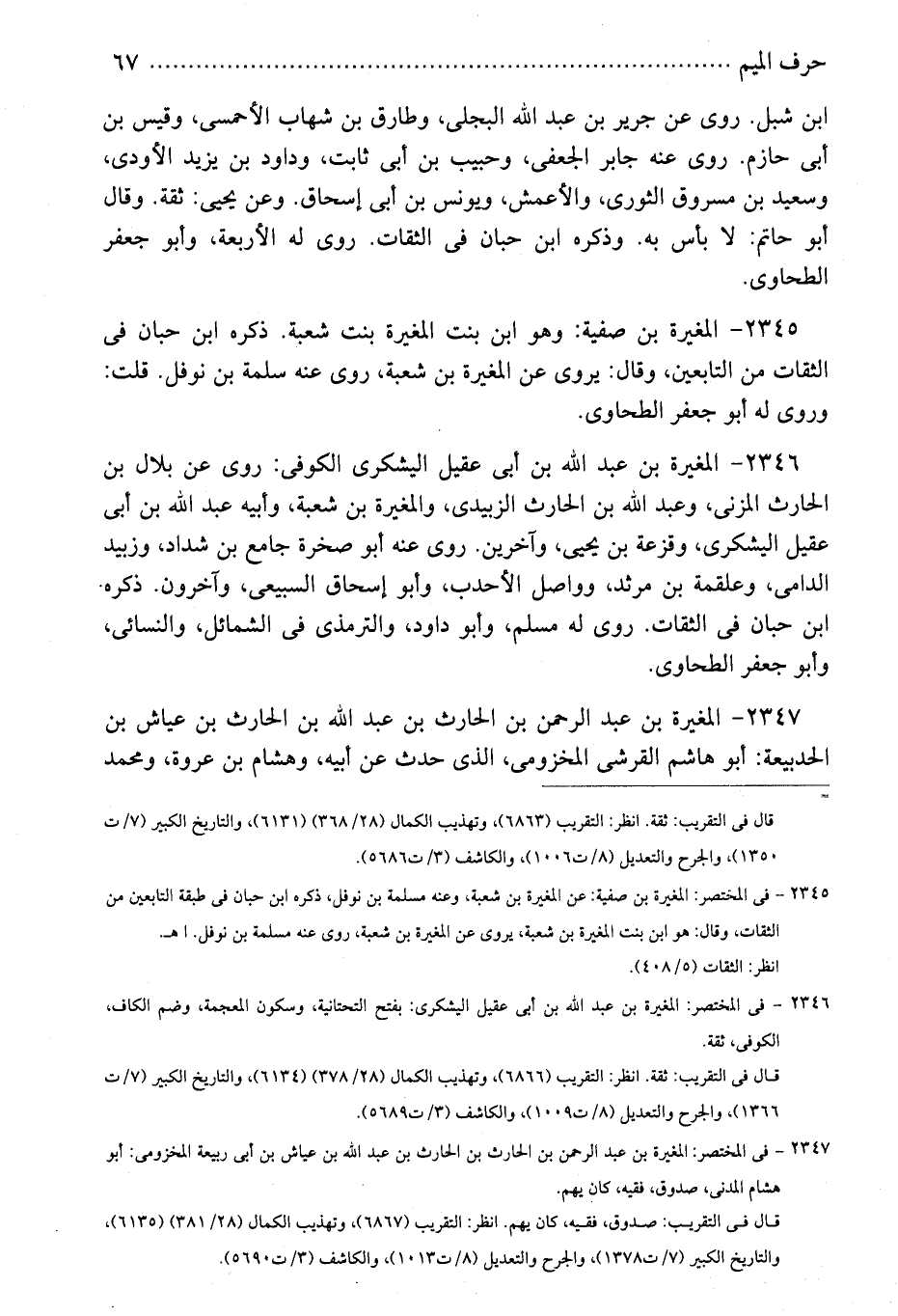 2345 - المغيرة بن صفية: وهو ابن بنت المغيرة بنت شعبة. ذكره ابن حبان فى الثقات من التابعين، وقال: يروى عن المغيرة بن شعبة، روى عنه سلمة بن نوفل. قلت: وروى له أبو جعفر الطحاوى.