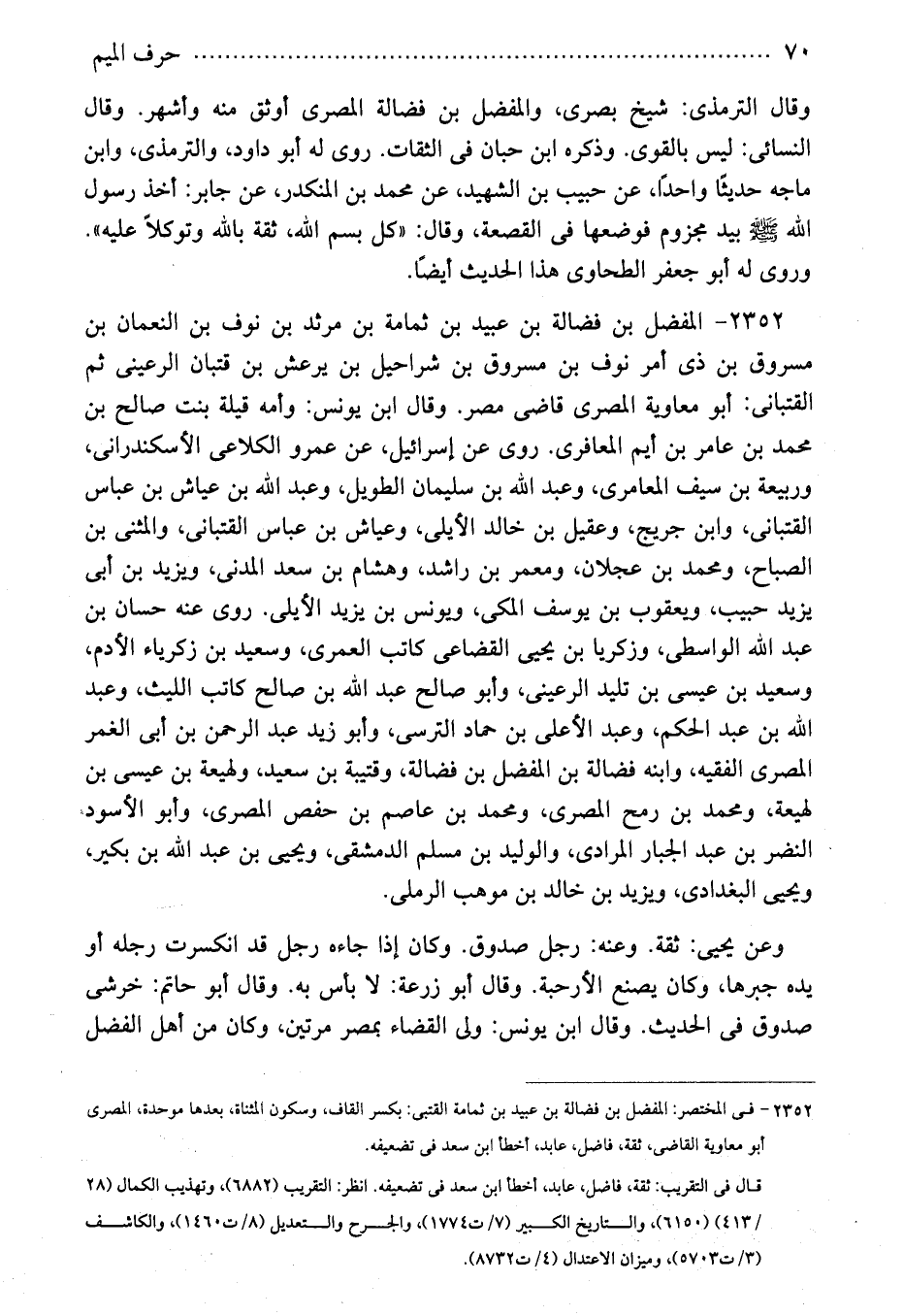 2352 - فى المختصر: المفضل بن فضالة بن عبيد بن ثمامة القتبى: بكسر القاف، وسكون المثناة، بعدها موحدة، المصرى أبو معاوية القاضى، ثقة، فاضل، عابد، أخطأ ابن سعد فى تضعيفه.