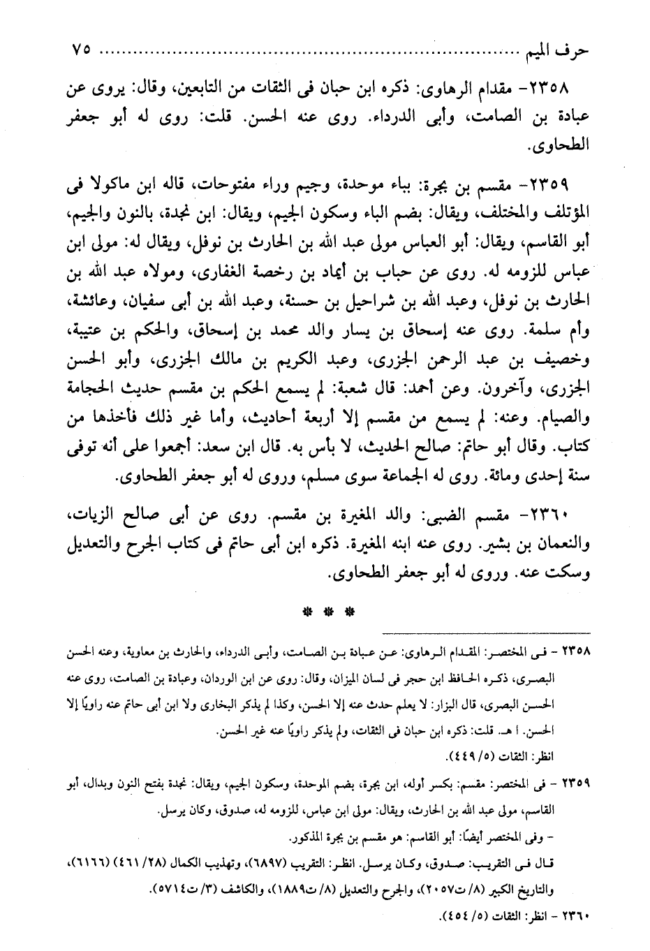 2359 - فى المختصر: مقسم: بكسر أوله، ابن بجرة، بضم الموحدة، وسكون الجيم، ويقال: نجدة بفتح النون وبدال، أبو القاسم، مولى عبد الله بن الحارث، ويقال: مولى ابن عباس، للزومه له، صدوق، وكان يرسل.