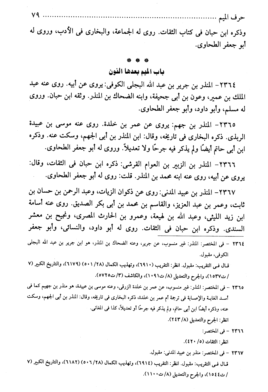 2365 - فى المختصر: المنذر: غير منسوب، عن عمر بن خلدة الزرقى، وعنه موسى بن عبيدة، هو منذر بن جهيم كما فى أسد الغابة والإصابة فى ترجمة أم عمر بن خلدة، ذكره البخارى فى تاريخه، وقال: المنذر بن أبى الجهم، وسكت عنه، وذكره أيضًا ابن أبى حاتم، ولم يذكر فيه جرحًا أو تعديلاً، كذا فى المغانى.