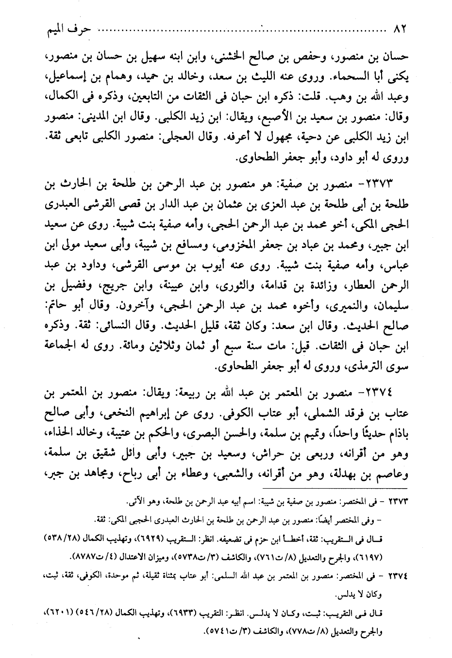 2374 - فى المختصر: منصور بن المعتمر بن عبد الله السلمى: أبو عتاب بمثناة ثقيلة، ثم موحدة، الكوفى، ثقة، ثبت، وكان لا يدلس.