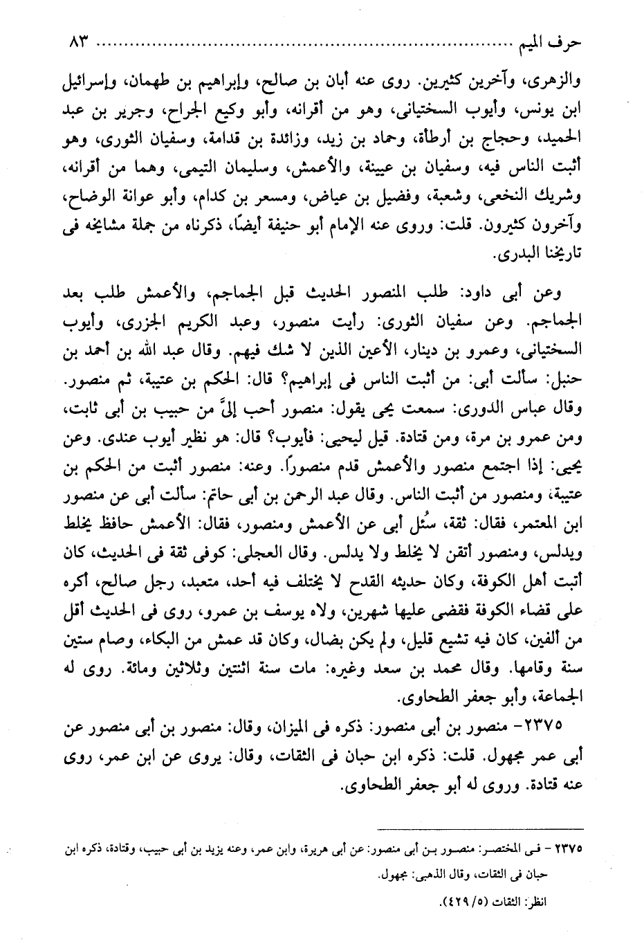 2375 - منصور بن أبى منصور: ذكره فى الميزان، وقال: منصور بن أبى منصور عن أبى عمر مجهول. قلت: ذكره ابن حبان فى الثقات، وقال: يروى عن ابن عمر، روى عنه قتادة. وروى له أبو جعفر الطحاوى.