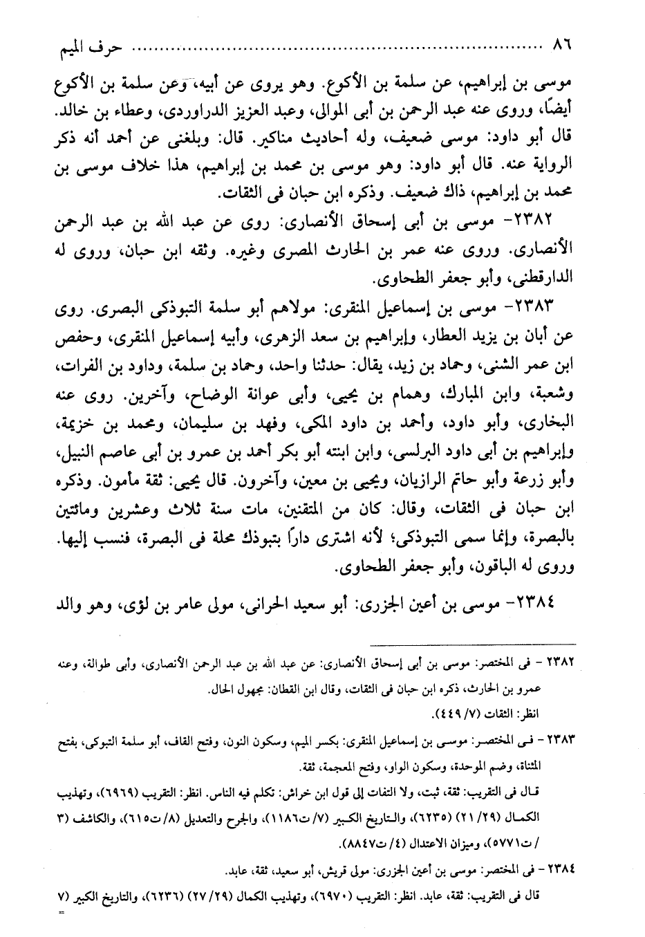 2382 - موسى بن أبى إسحاق الأنصارى: روى عن عبد الله بن عبد الرحمن الأنصارى. وروى عنه عمر بن الحارث المصرى وغيره. وثقه ابن حبان، وروى له الدارقطنى، وأبو جعفر الطحاوى.