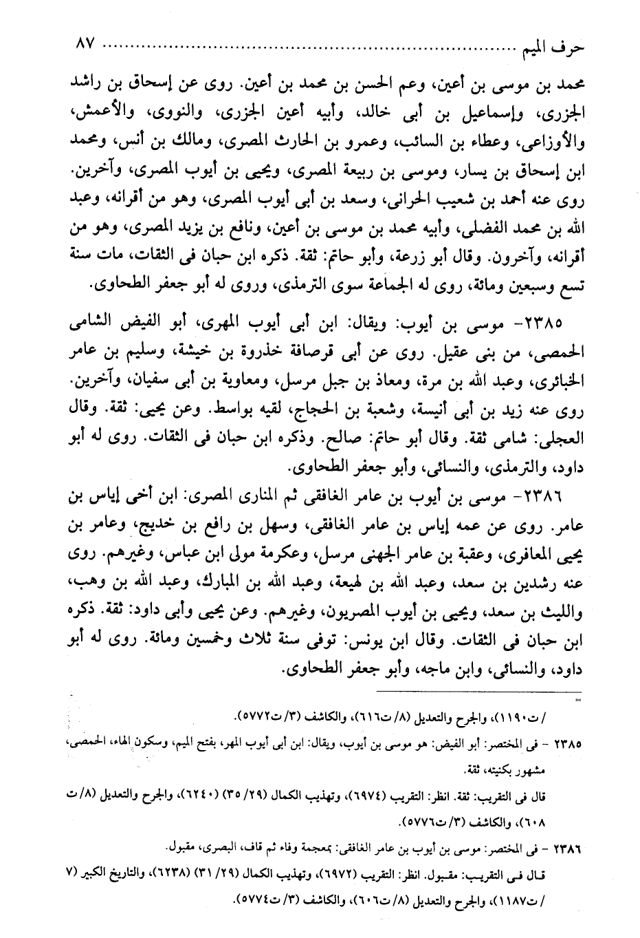 2385 - موسى بن أيوب: ويقال: ابن أبى أيوب المهرى، أبو الفيض الشامى الحمصى، من بنى عقيل. روى عن أبى قرصافة خذروة بن خيشة، وسليم بن عامر الخبائرى، وعبد الله بن مرة، ومعاذ بن جبل مرسل، ومعاوية بن أبى سفيان، وآخرين. روى عنه زيد بن أبى أنيسة، وشعبة بن الحجاج، لقيه بواسط. وعن يحيى: ثقة. وقال العجلى: شامى ثقة. وقال أبو حاتم: صالح. وذكره ابن حبان فى الثقات. روى له أبو داود، والترمذى، والنسائى، وأبو جعفر الطحاوى.