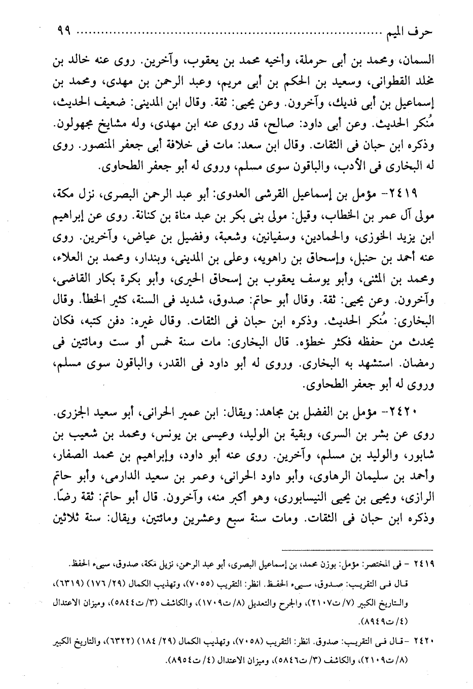 2419 - فى المختصر: مؤمل: بوزن محمد، بن إسماعيل البصرى، أبو عبد الرحمن، نزيل مكة، صدوق، سيىء الحفظ.