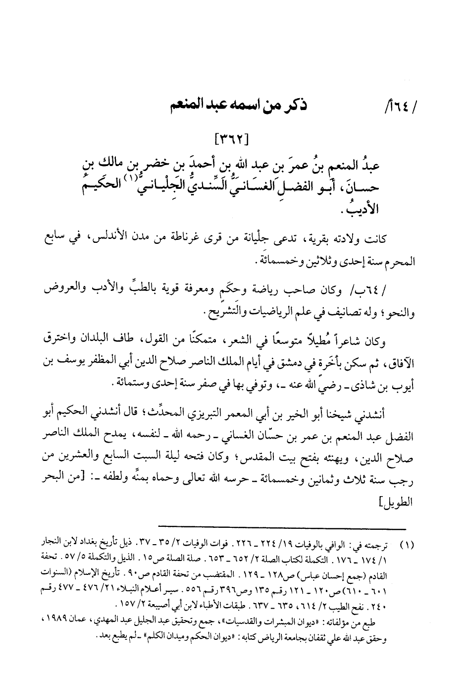 انشدني شيخنا أبو الخير بن أبي المعمر التبريزي المحدثِّ؛ قال أنشدني الحكيم أبو الفضل عبد المنعم بن عمر بن حسان الغساني - رحمه الله - لنفسه، يمدح الملك الناصر صلاح الدين، ويهنئه بفتح بيت المقدس؛ وكان فتحه السبت السابع والعشرين من رجب سنة ثلاث وثمانين وخمسمائة - حرسه الله تعالى وحماه بمنِّه ولطفه -: [من البحر الطويل]
