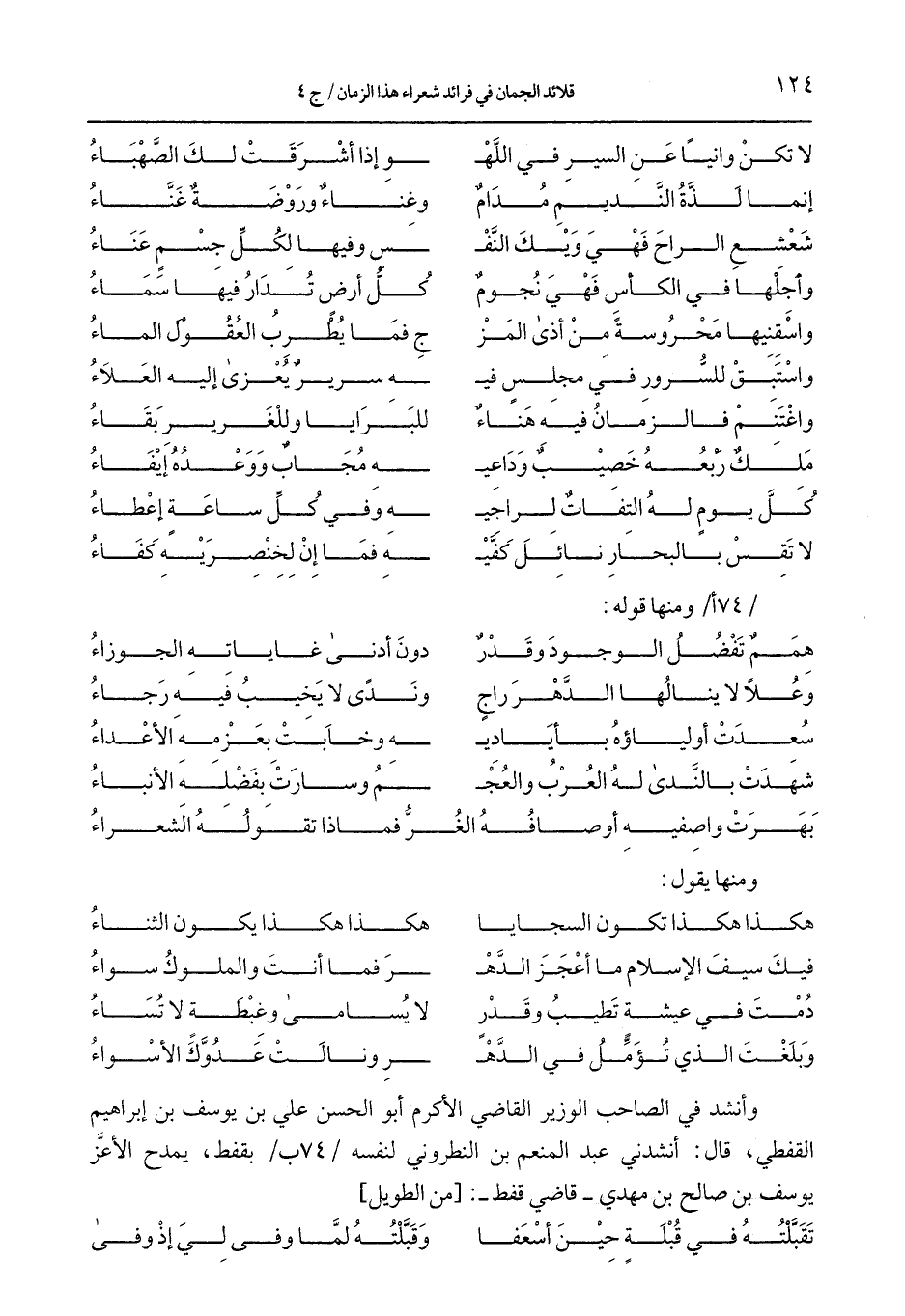 وأنشد في الصاحب الوزير القاضي الأكرم أبو الحسن علي بن يوسف بن إبراهيم القفطي، قال: أنشدني عبد المنعم بن النطروني لنفسه / 74 ب/ بقفط، يمدح الأعَّز يوسف بن صالح بن مهدي – قاضي فقط -: [من الطويل]