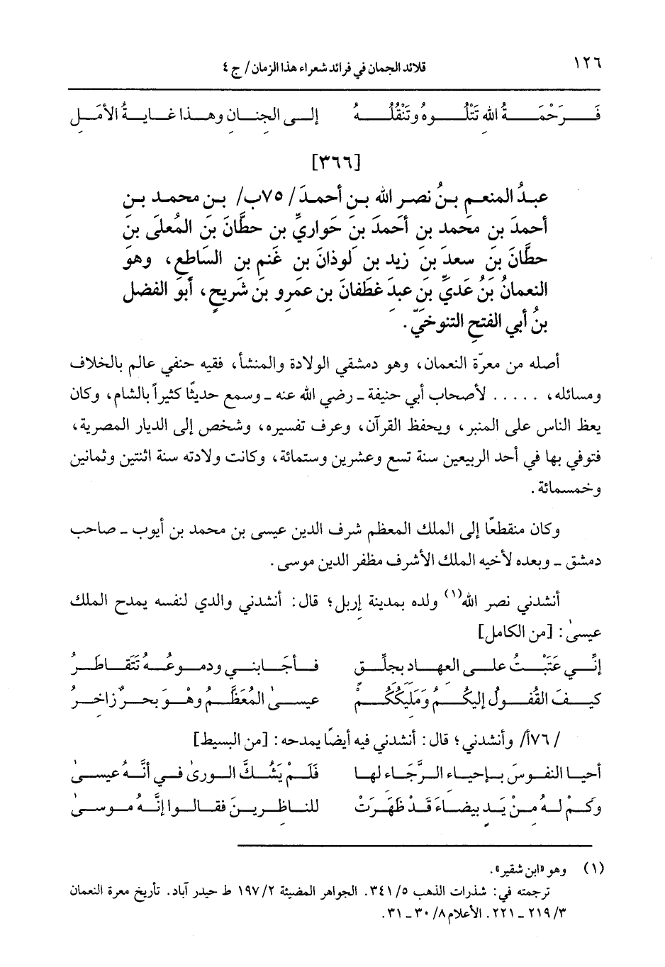 عبد المنعم بن نصر الله بن أحمد / 75 ب/ ن محمد بن أحمد بن محمد بن أحمد بن حواريِّ بن حطَّان بن المعلى بن حطَّان بن سعد بن زيد بن لوذان بن غنم بن الساطع، وهو النعمان بن عدِّ بن غطفان بن عمرو بن شريحٍ، أبو الفضل بن أبي الفتح التنوخيّ.