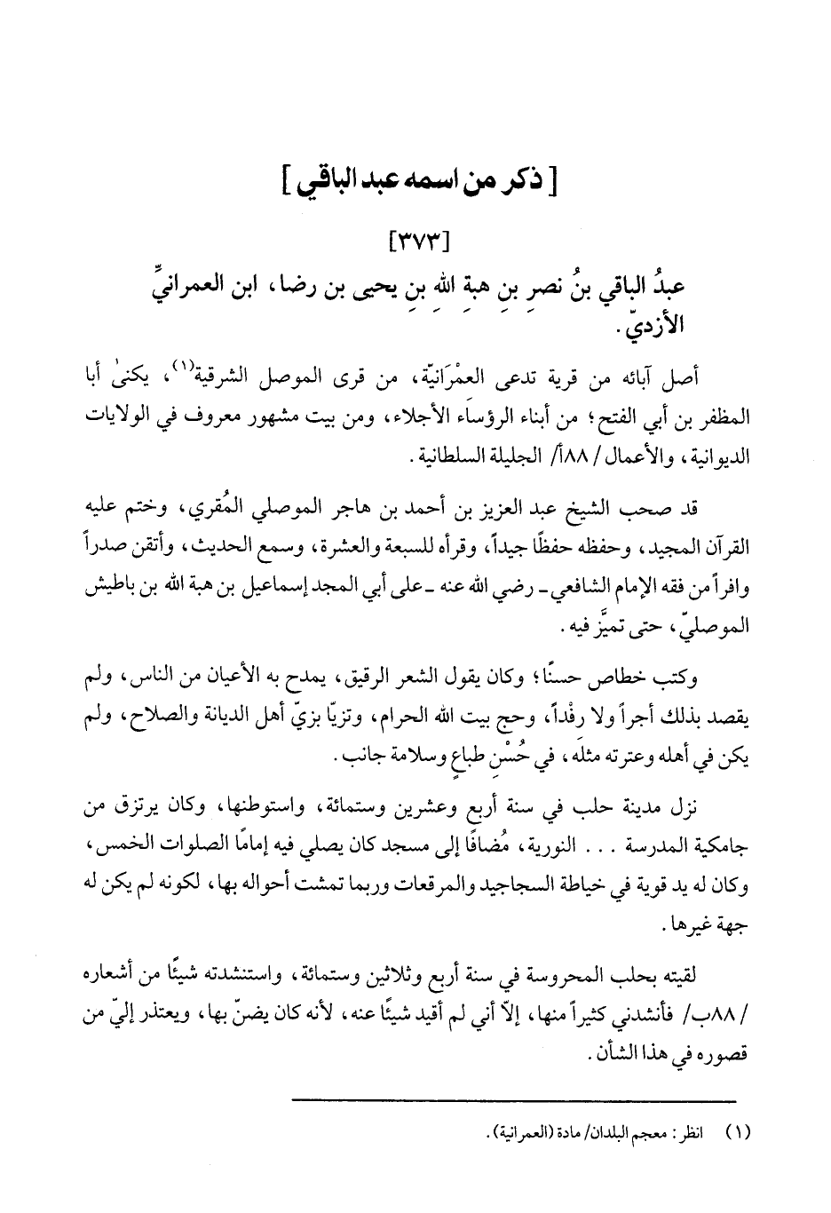 عبد الباقي بن نصر بن هبة الله بن يحيى بن رضا، ابن العمرانيّ الأزديّ.