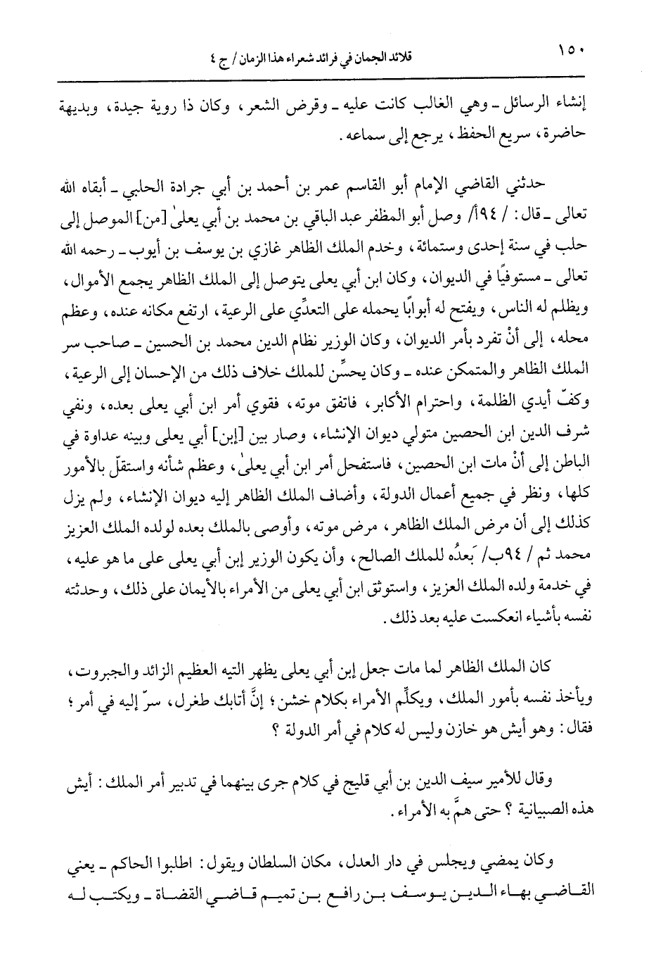 حدثني القاضي الإمام أبو القاسم عمر بن أحمد بن أبي جرادة الحلبي –أبقاه الله تعالى- قال: /94 أ/ وصل أبو المظفر عبد الباقي بن محمد بن أبي يعلى [من] الموصل إلى حلب في سنة إحدى وستمائة، وخدم الملك الظاهر غازي بن يوسف بن أيوب –رحمه الله تعالى- مستوفياً في الديوان، وكان ابن أبي يعلى يتوصل إلى الملك الظاهر يجمع الأموال، ويظلم له الناس، ويفتح له أبواباً يحمله على التعدّي على الرعية، ارتفع مكانه عنده، وعظم محله، إلى أن تفرد بأمر الديوان، وكان الوزير نظام الدين محمد بن الحسين –صاحب سر الملك الظاهر والمتمكن عنده- وكان يحسّن للملك خلاف ذلك من الإحسان إلى الرعية، وكفّ أيدي الظلمة، واحترام الأكابر، فاتفق موته، فقوي أمر ابن أبي يعلى بعده، ونفي شرف الدين ابن الحصين متولي ديوان الإنشاء، وصار بين [إبن] أبي يعلى وبينه عداوة في الباطن إلى أن مات ابن الحصين، فاستفحل أمر ابن أبي يعلى، وعظم شانه واستقلّ بالأمور كلها، ونظر في جميع أعمال الدولة، وأضاف الملك الظاهر إليه ديوان الإنشاء، ولم يزل كذلك إلى أن مرض الملك الظاهر، مرض موته، وأوصى بالملك بعده لولده الملك العزيز محمد ثم /94 ب/ بعده للملك الصالح، وأن يكون الوزير ابن أبي يعلى على ما هو عليه، في خدمة ولده الملك العزيز، واستوثق ابن أبي يعلى من الأمراء بالأيمان على ذلك، وحدثته نفسه بأشياء انعكست عليه بعد ذلك.