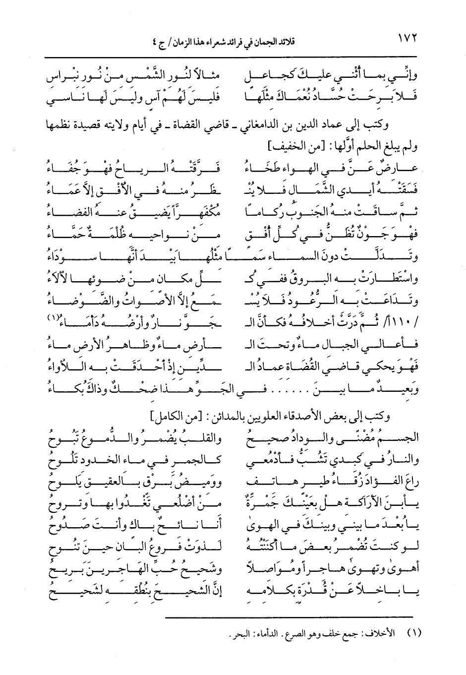 وكتب إلى عماد الدين بن الدامغاني –قاضي القضاة- في أيام ولايته قصيدة نظمها ولم يبلغ الحلم أوّلها": [من الخفيف]
