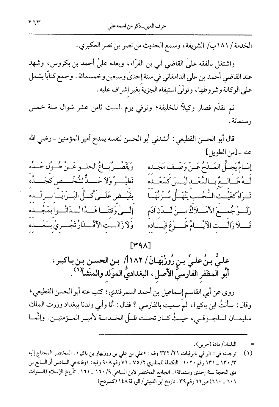 عليُّ بن عليِّ بن روزبهان /182 أ/ بن الحسن بن باكير، أبو المظفر الفارسيُّ الأصل، البغداديُّ المولد والمنشأ.