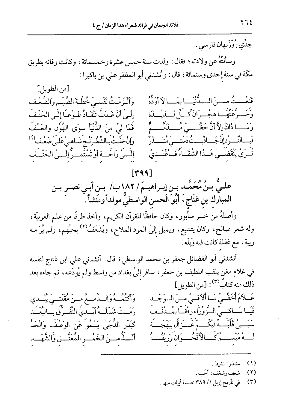 أنشدني أبو الفضائل جعفر بن محمد الواسطي؛ قال: أنشدني علي ابن غناج لنفسه في غلام مغن يلقب اللطيف بن جعفر، سافر إلى بغداد من واسط ولم يودّعه، ثم جاءه بعد ذلك منه كتاب: [من الطويل]