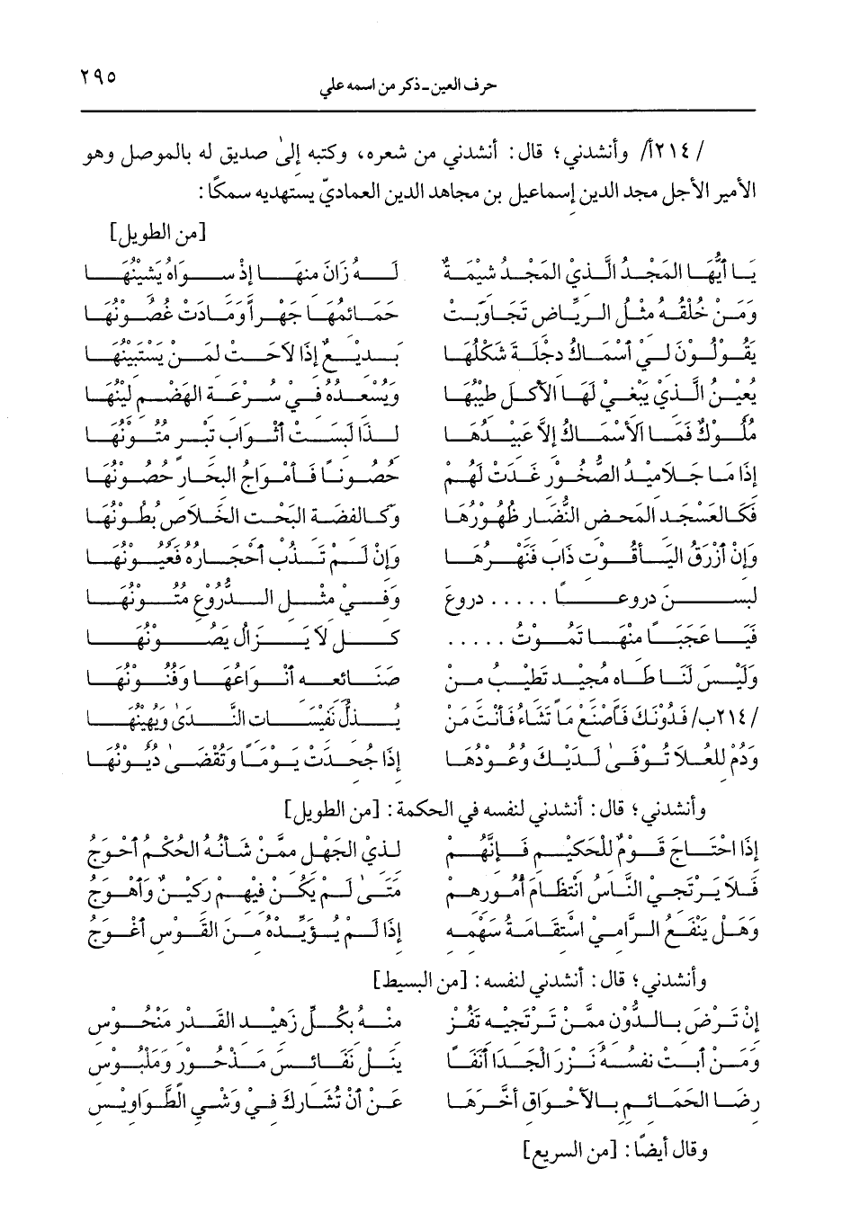 /214 أ/وأنشدني؛ قال: أنشدني من شعره, وكتبه إلى صديق له بالموصل وهو