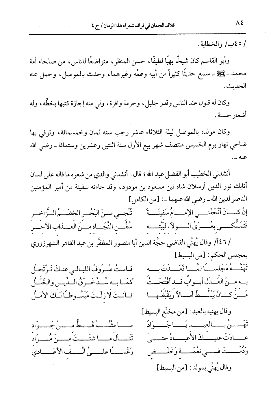 / 46 أ/ وقال يهنِّي القاضي حجَّة الدين أبا منصور المظفَّر بن عبد القاهر الشهرزوري
