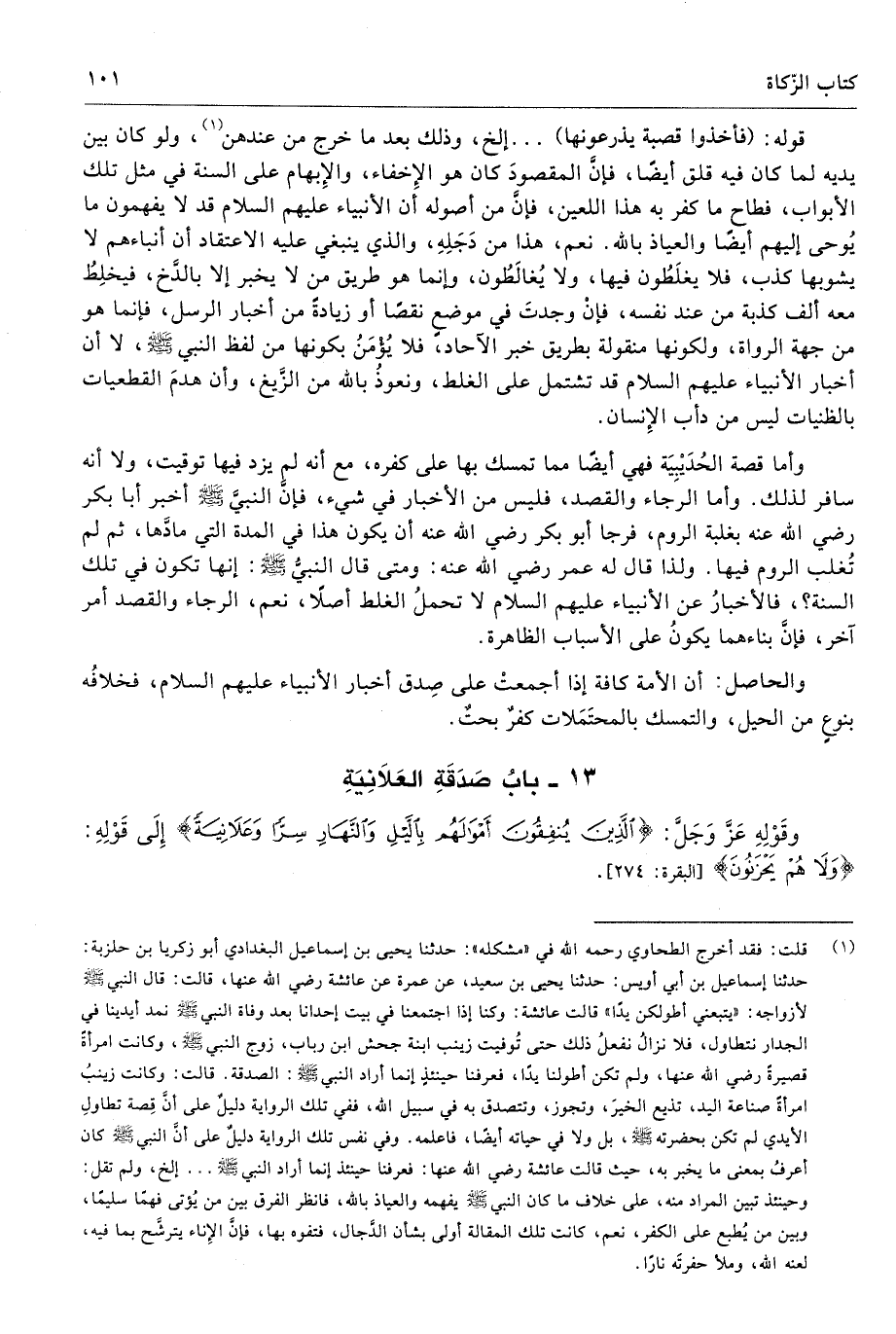 (¬1) قلت: فقد أخرج الطحاوي رحمه الله في "مشكله": حدثنا يحيى بن إسماعيل البغدادي أبو زكريا بن حلزبة: حدثنا إسماعيل بن أبي أويس: حدثنا يحيى بن سعيد، عن عمرة عن عائشة رضي الله عنها، قالت: قال النبي - صلى الله عليه وسلم - لأزواجه: "يتبعني أطولكن يدًا" قالت عائشة: وكنا إذا اجتمعنا في بيت إحدانا بعد وفاة النبي - صلى الله عليه وسلم - نمد أيدينا في الجدار نتطاول، فلا نزالُ نفعلُ ذلك حتى تُوفيت زينب ابنة جحش ابن رباب، زوج النبي - صلى الله عليه وسلم -، وكانت امرأة قصيرةً رضي الله عنها، ولم تكن أطولنا يدًا، فعرفنا حينئذٍ إنما أراد النبي - صلى الله عليه وسلم -: الصدقة. قالت: وكانت زينبُ امرأةً صناعة اليد، تذيع الخيرَ، وتجوز، وتتصدق به في سبيل الله، ففي تلك الرواية دليلٌ على أنَّ قِصة تطاولِ الأيدي لم تكن بحضرته - صلى الله عليه وسلم -، بل ولا في حياته أيضًا، فاعلمه. وفي نفس تلك الرواية دليلٌ على أنَّ النبي - صلى الله عليه وسلم - كان أعرفُ بمعنى ما يخبر به، حيث قالت عائشة رضي الله عنها: فعرفنا حينئذ إنما أراد النبي - صلى الله عليه وسلم - ... إلخ، ولم تقل: وحينئذ تبين المراد منه، على خلاف ما كان النبي - صلى الله عليه وسلم - يفهمه والعياذ بالله، فانظر الفرق بين من يُؤتى فهمًا سليمًا، وبين من يُطبع على الكفر، نعم، كانت تلك المقالة أولى بشأن الدَّجال، فتفوه بها، فإنَّ الإِناء يترشَّح بما فيه، لعنه الله، وملأ حفرتَه نارًا.