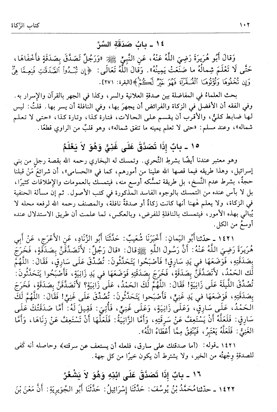 1421 - حَدَّثَنَا أَبُو الْيَمَانِ أَخْبَرَنَا شُعَيْبٌ حَدَّثَنَا أَبُو الزِّنَادِ عَنِ الأَعْرَجِ عَنْ أَبِى هُرَيْرَةَ - رضى الله عنه - أَنَّ رَسُولَ اللَّهِ - صلى الله عليه وسلم - قَالَ «قَالَ رَجُلٌ لأَتَصَدَّقَنَّ بِصَدَقَةٍ. فَخَرَجَ بِصَدَقَتِهِ فَوَضَعَهَا فِى يَدِ سَارِقٍ فَأَصْبَحُوا يَتَحَدَّثُونَ تُصُدِّقَ عَلَى سَارِقٍ. فَقَالَ اللَّهُمَّ لَكَ الْحَمْدُ لأَتَصَدَّقَنَّ بِصَدَقَةٍ. فَخَرَجَ بِصَدَقَتِهِ فَوَضَعَهَا فِى يَدَىْ زَانِيَةٍ، فَأَصْبَحُوا يَتَحَدَّثُونَ تُصُدِّقَ اللَّيْلَةَ عَلَى زَانِيَةٍ. فَقَالَ اللَّهُمَّ لَكَ الْحَمْدُ عَلَى زَانِيَةٍ، لأَتَصَدَّقَنَّ بِصَدَقَةٍ. فَخَرَجَ بِصَدَقَتِهِ فَوَضَعَهَا فِى يَدَىْ غَنِىٍّ فَأَصْبَحُوا يَتَحَدَّثُونَ تُصُدِّقَ عَلَى غَنِىٍّ فَقَالَ اللَّهُمَّ لَكَ الْحَمْدُ، عَلَى سَارِقٍ وَعَلَى زَانِيَةٍ وَعَلَى غَنِىٍّ. فَأُتِىَ فَقِيلَ لَهُ أَمَّا صَدَقَتُكَ عَلَى سَارِقٍ فَلَعَلَّهُ أَنْ يَسْتَعِفَّ عَنْ سَرِقَتِهِ، وَأَمَّا الزَّانِيَةُ فَلَعَلَّهَا أَنْ تَسْتَعِفَّ عَنْ زِنَاهَا، وَأَمَّا الْغَنِىُّ فَلَعَلَّهُ يَعْتَبِرُ فَيُنْفِقُ مِمَّا أَعْطَاهُ اللَّهُ». تحفة 13735 - 138/ 2