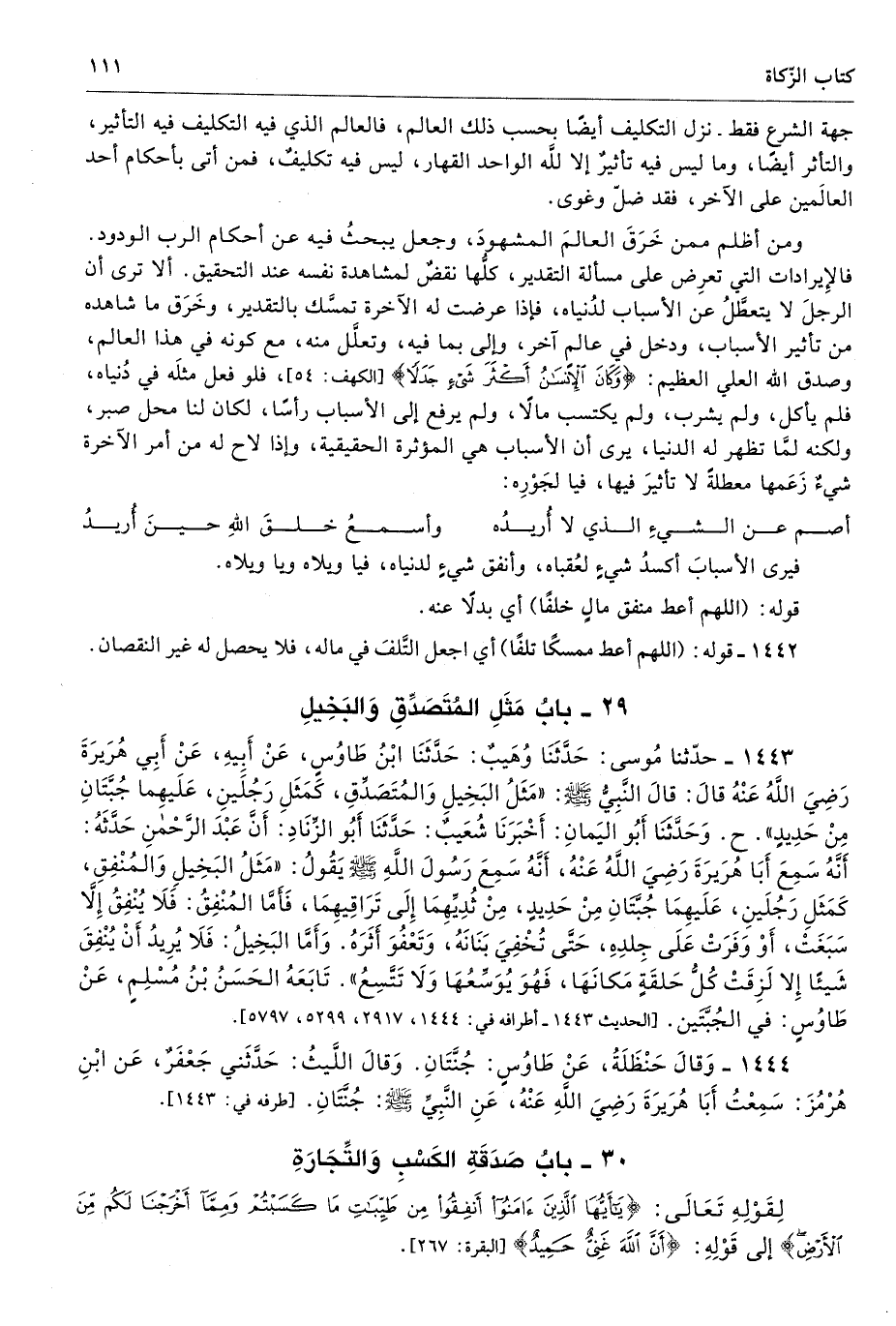1443 - حَدَّثَنَا مُوسَى حَدَّثَنَا وُهَيْبٌ حَدَّثَنَا ابْنُ طَاوُسٍ عَنْ أَبِيهِ عَنْ أَبِى هُرَيْرَةَ - رضى الله عنه - قَالَ قَالَ النَّبِىُّ - صلى الله عليه وسلم - «مَثَلُ الْبَخِيلِ وَالْمُتَصَدِّقِ كَمَثَلِ رَجُلَيْنِ، عَلَيْهِمَا جُبَّتَانِ مِنْ حَدِيدٍ». وَحَدَّثَنَا أَبُو الْيَمَانِ أَخْبَرَنَا شُعَيْبٌ حَدَّثَنَا أَبُو الزِّنَادِ أَنَّ عَبْدَ الرَّحْمَنِ حَدَّثَهُ أَنَّهُ سَمِعَ أَبَا هُرَيْرَةَ - رضى الله عنه - أَنَّهُ سَمِعَ رَسُولَ اللَّهِ - صلى الله عليه وسلم - يَقُولُ «مَثَلُ الْبَخِيلِ وَالْمُنْفِقِ كَمَثَلِ رَجُلَيْنِ، عَلَيْهِمَا جُبَّتَانِ مِنْ حَدِيدٍ، مِنْ ثُدِيِّهِمَا إِلَى تَرَاقِيهِمَا، فَأَمَّا الْمُنْفِقُ فَلاَ يُنْفِقُ إِلاَّ سَبَغَتْ - أَوْ وَفَرَتْ - عَلَى جِلْدِهِ حَتَّى تُخْفِىَ بَنَانَهُ وَتَعْفُوَ أَثَرَهُ، وَأَمَّا الْبَخِيلُ فَلاَ يُرِيدُ أَنْ يُنْفِقَ شَيْئًا إِلاَّ لَزِقَتْ كُلُّ حَلْقَةٍ مَكَانَهَا، فَهُوَ يُوَسِّعُهَا وَلاَ تَتَّسِعُ». تَابَعَهُ الْحَسَنُ بْنُ مُسْلِمٍ عَنْ طَاوُسٍ فِى الْجُبَّتَيْنِ. أطرافه 1444، 2917، 5299، 5797 - تحفة 13520، 13751، 13517 - 143/ 2